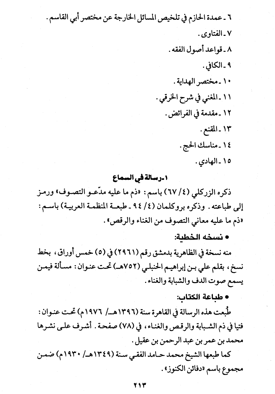 طُبعت هذه الرسالة في القاهرة سنة (1396 هـ / 1976 م) تحت عنوان: فتيا في ذم الشبابة والرقص والغناء، في (78) صفحة. أشرف على نشرها محمد بن عمر بن عبد الرحمن بن عقيل.