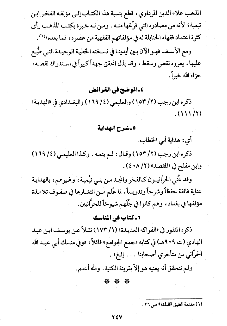 المذهب علاء الدين المرداوي، قطع بنسبة هذا الكتاب إلى مؤلفه الفخر ابن تيمية؛ لأنه من مصادره التي فرغها منه، ومن له خبرة بكتب المذهب رأى كثرة اعتماد فقهاء الحنابلة له في مؤلفاتهم الفقهية من عصره، فما بعده" (¬1).