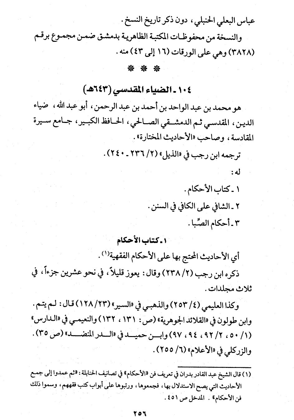 (¬1) قال الشيخ عبد القادر بدران في تعريف فن "الأحكام" في تصانيف الحنابلة: "ثم عمدوا إلى جمع الأحاديث التي يصح الإستدلال بها، فجمعوها، ورتبوها على أبواب كتب فقههم، وسموا ذلك فن الأحكام". المدخل ص 451.