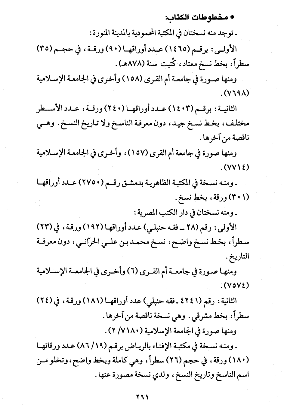 - ومنه نسخة في مكتبة الإفتاء بالرياض برقم (19/ 86) عدد ورقاتها (180) ورقة، في حجم (26) سطرًا، وهي كاملة وبخط واضح، وتخلو من اسم الناسخ وتاريخ النسخ، ولدي نسخة مصورة عنها.