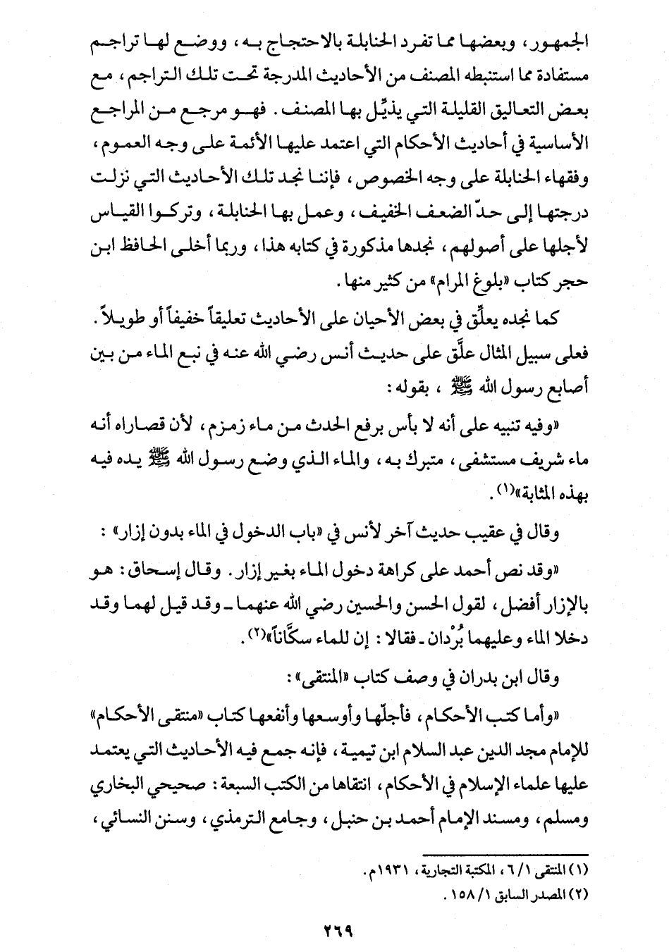 "وأما كتب الأحكام، فأجلّها وأوسعها وأنفعها كتاب "منتقى الأحكام" للإمام مجد الدين عبد السلام ابن تيمية، فإنه جمع فيه الأحاديث التي يعتمد عليها علماء الإسلام في الأحكام، انتقاها من الكتب السبعة: صحيحي البخاري ومسلم، ومسند الإمام أحمد بن حنبل، وجامع الترمذي، وسنن النسائي،