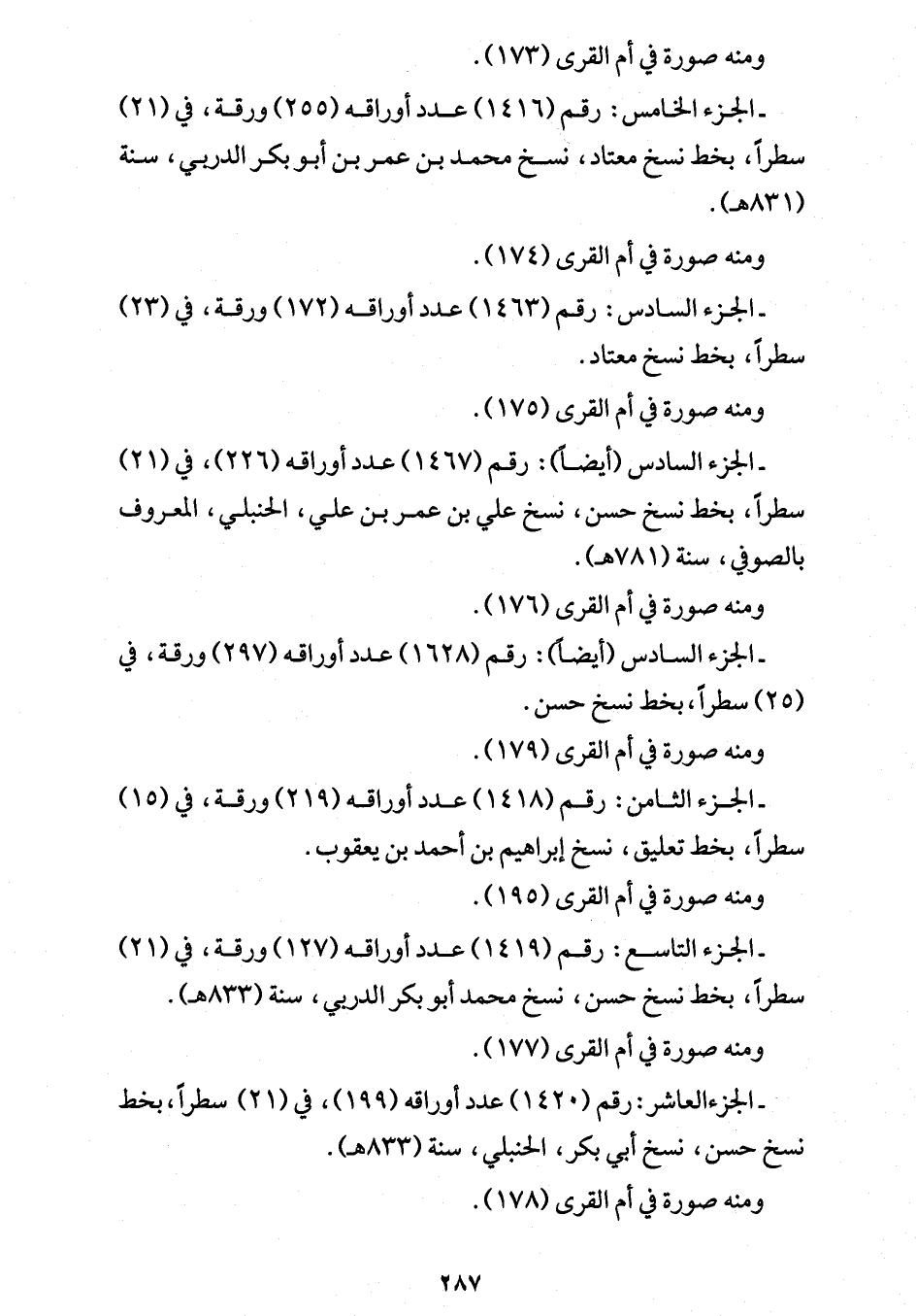 - الجزء التاسع: رقم (1419) عدد أوراقه (127) ورقة، في (21) سطراً، بخط نسخ حسن، نسخ محمد أبو بكر الدربي، سنة (833 هـ). ومنه صورة في أم القرى (177).
