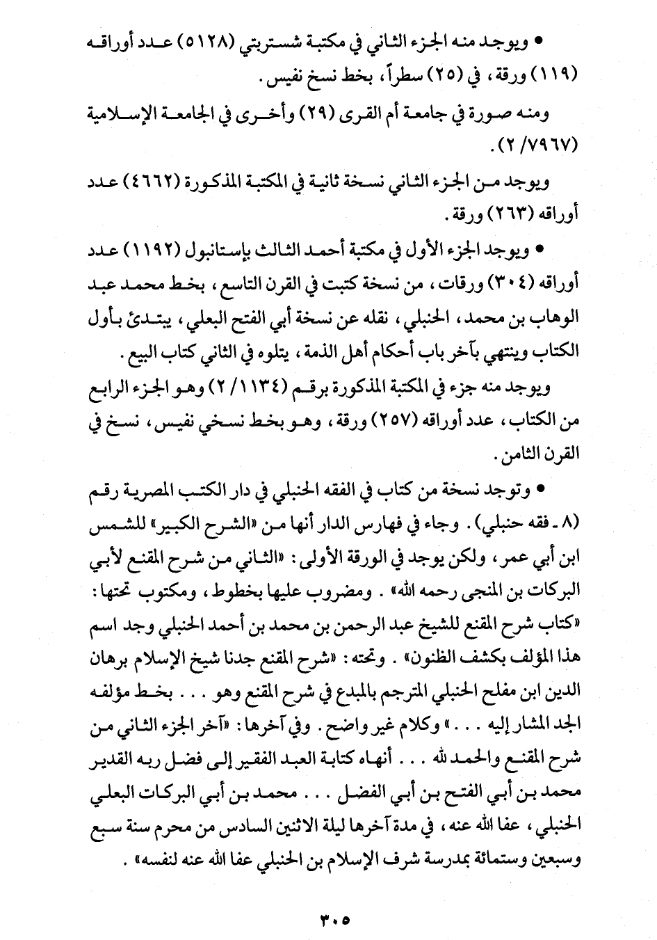 • ويوجد الجزء الأول في مكتبة أحمد الثالث بإستانبول (1192) عدد أوراقه (304) ورقات، من نسخة كتبت في القرن الناسع، بخط محمد عبد الوهاب بن محمد، الحنبلي، نقله عن نسخة أبي الفتح البعلي، يبتدئ بأول الكناب وينتهي بآخر باب أحكام أهل الذمة، يتلوه في الثاني كتاب البيع.