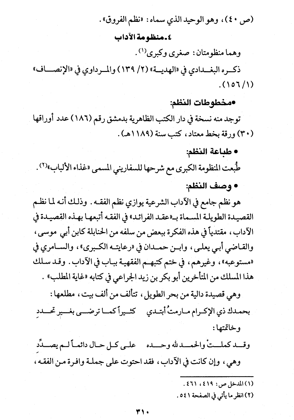 هو نظم جامع في الآداب الشرعية يوازي نظم الفقه. وذلك أنه لما نظم القصيدة الطويلة المسماة بـ "عقد الفرائد" في الفقه أتبعها بهذه القصيدة في الآداب، مقتدياً في هذه الفكرة ببعض من سلف 5 من الحنابلة كإبن أبي موسى، والقاضي أبي يعلى، وابن حمدان في "رعايته الكبرى"، والسامري في "مستوعبه"، وغيرهم، في ختم كتبهم الفقهية بباب في الآداب. وقد سلك هذا المسلك من المتأخرين أبو بكر بن زيد الجراعي في كتابه "غاية المطلب".