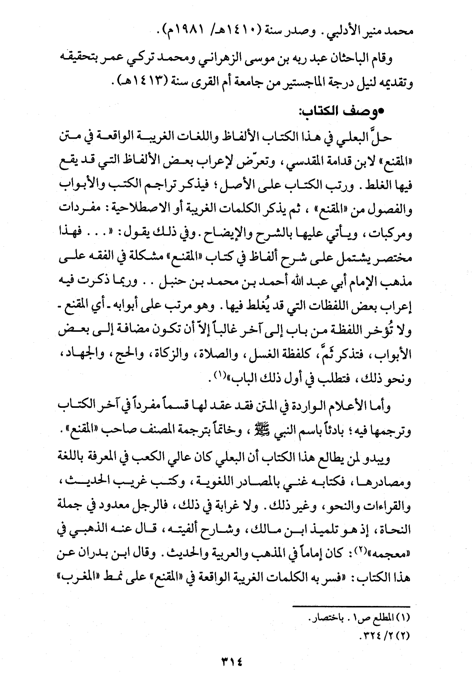 ويبدو لمن يطالع هذا الكتاب أن البعلي كان عالي الكعب في المعرفة باللغة ومصادرها، فكتابه غني بالمصادر اللغوية، وكتب غريب الحديث، والقراءات والنحو، وغير ذلك. ولا غرابة في ذلك، فالرجل معدود في جملة النحاة، إذ هو تلميذ ابن مالك، وشارح ألفيته، قال عنه الذهبي في "معجمه" (¬2): كان إِماما في المذهب والعربية والحديث. وقال ابن بدران ين هذا الكتاب: "فسر به الكلمات الغريبة الواقعة في "المقنع" على نمط "المغرب"