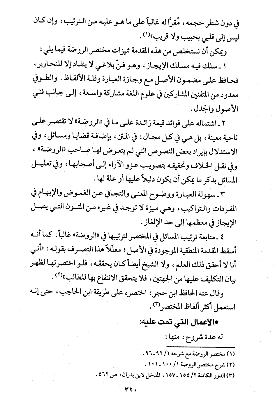 4 - متابعة ترتيب المسائل في المختصر لترتيبها في "الروضة" غالباً. كما أنه أسقط المقدمة المنطقية الموجودة في الأصل؛ معلّلاً هذا التصرف بقوله: "أني أنا لا أحقق ذلك العلم، ولا الشيخ أيضاً كان يحققه، فلو اختصرتها لظهر بيان التكليف عليها من الجهتين، فلا يتحقق الإنتفاع بها للطالب" (¬2).