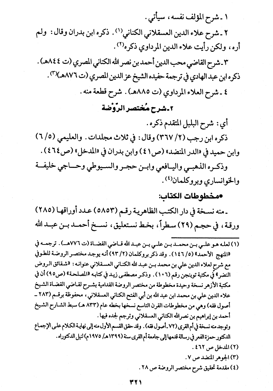 (¬1) لعله هو علي بن محمد بن علي بن عبد الله قاضي القضاة (ت 776 هـ). ترجمه في "المنهج الأحمد" (5/ 146). وقد ذكر بروكلمان (2/ 93) أنه يوجد مختصر الروضة للطوفي مع شرحِ لعلاء الدين علي بن محمد بن عبد الله الكناني العسقلاني عنوانه: "شقائق الروض النضر" في مكتبة توبنجن رقم (106). وذكر مصطفى زيد في كتابه "المصلحة" (ص 95) أن في مكتبة الأزهر نسخة وحيدة مخطوطة من مختصر الروضة القدامية بشرح لقاضي القضاة الشيخ علاء الدين علي بن محمد ابن عبد الله بن أبي الفتح الكناني العسقلاني، محفوظة برقم (283 - أصول فقه) وهي من مخطوطات القرن التاسع نسخها بخطه عام (833 هـ) سبط الشارح الشيخ أحمد بن إبراهم بن نصرالله الكناني العسقلاني وترجم لجده فيها.