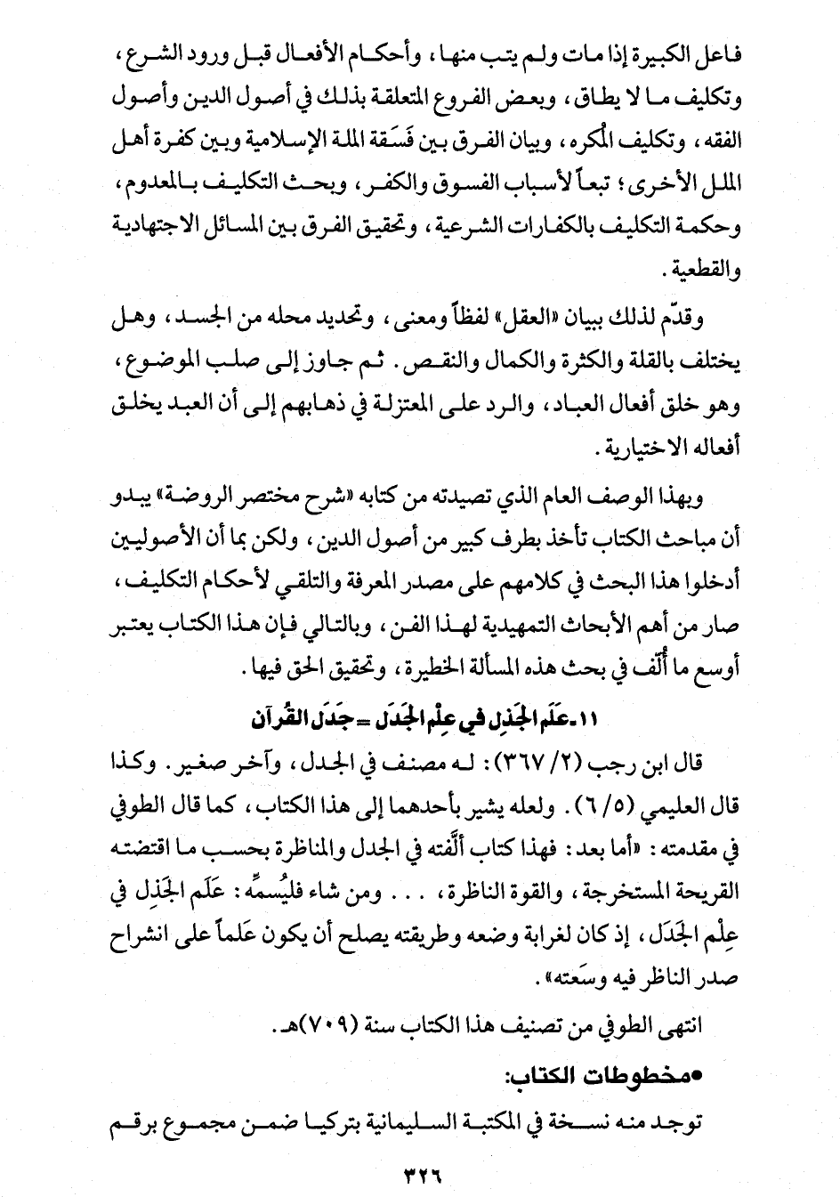 وبهذا الوصف العام الذي تصيدته من كتابه "شرح مختصر الروضة" يبدو أن مباحث الكتاب تأخذ بطرف كبير من أصول الدين، ولكن بما أن الأصوليين أدخلوا هذا البحث في كلامهم على مصدر المعرفة والتلقي لأحكام التكليف، صار من أهم الأبحاث التمهيدية لهذا الفن، وبالتالي فإن هذا الكتاب يعتبر أوسع ما أُلّف في بحث هذه المسألة الخطيرة، وتحقيق الحق فيها.