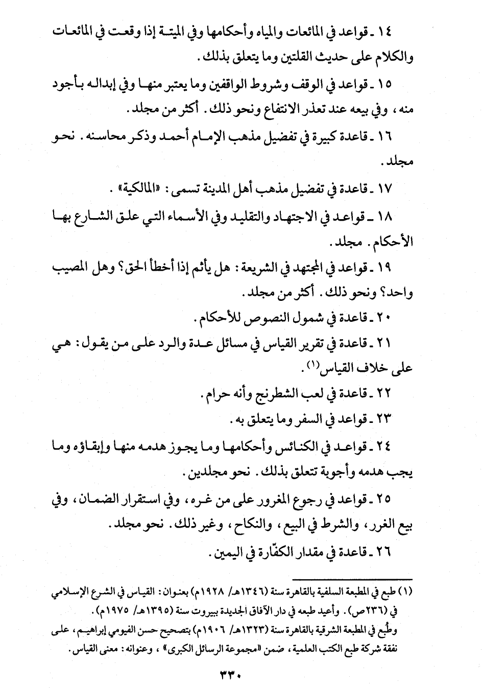 (¬1) طُبع في المطبعة السلفية بالقاهرة سنة (1346 هـ/ 1928 م) بعنوان: القياس في الشرع الإسلامي في (236 ص). وأعيد طبعه في دار الآفاق الجديدة ببيروت سنة (1395 هـ/ 1975 م).