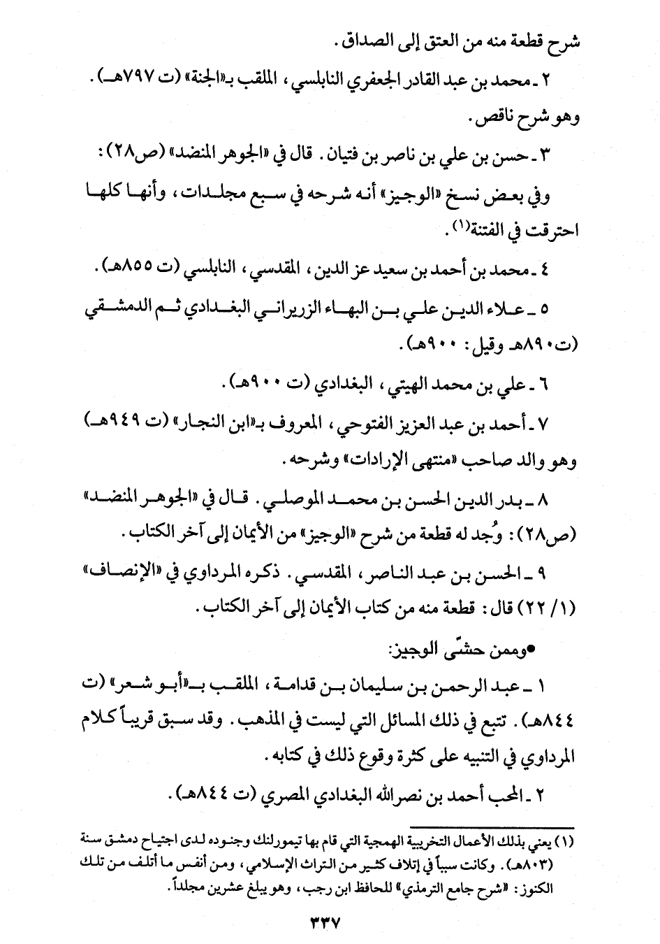 (¬1) يعني بذلك الأعمال التخريبية الهمجية التي قام بها تيمورلنك وجنوده لدى اجتياح دمشق سنة (803 هـ). وكانت سبباً في إتلاف كثير من التراث الإسلامي، ومن أنفس ما أتلف من تلك الكنوز: "شرح جامع الترمذي" للحافظ ابن رجب، وهو يبلغ عشرين مجلداً.