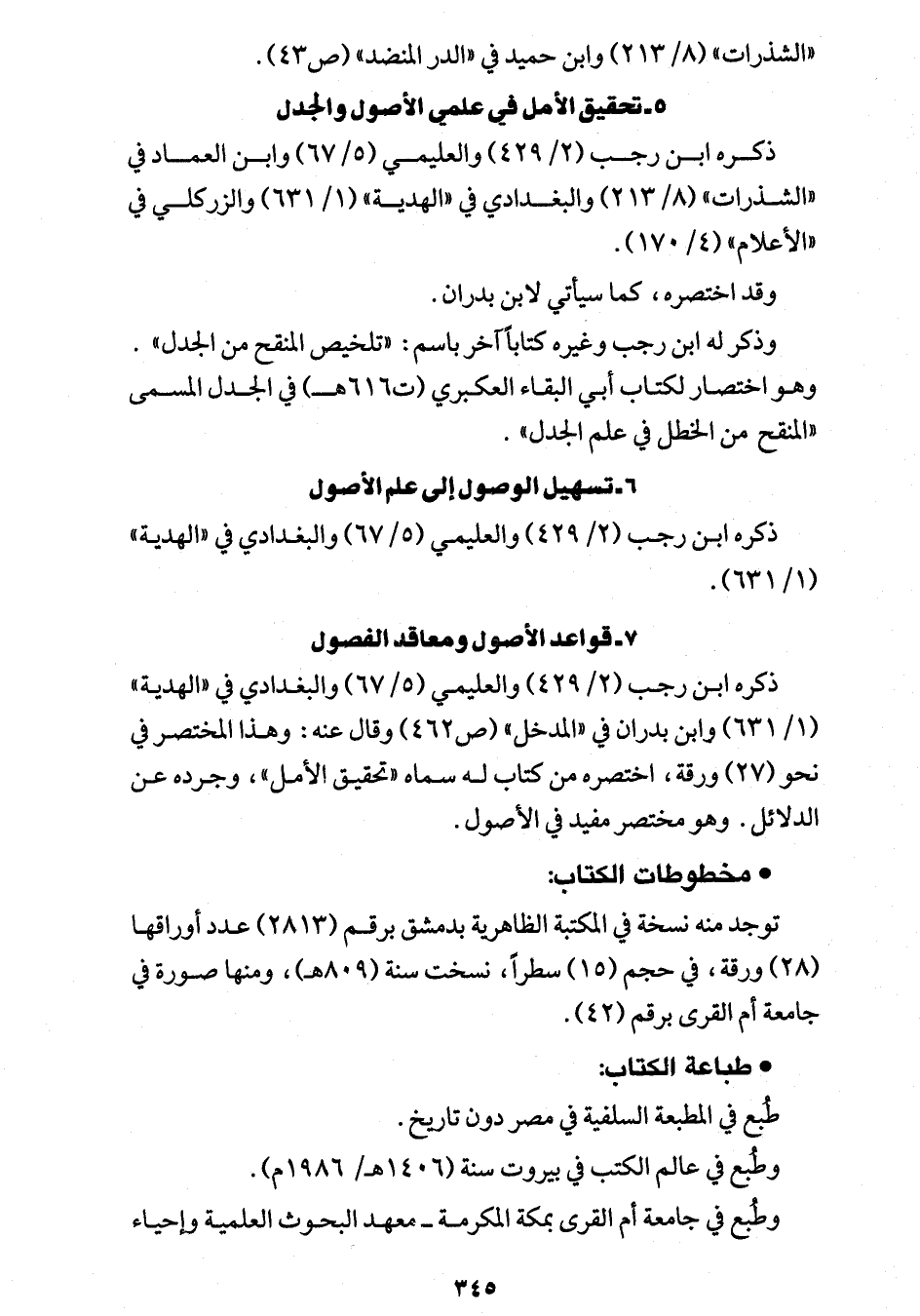 ذكره ابن رجب (2/ 429) والعليمي (5/ 67) والبغدادي في "الهدية" (1/ 631) وابن بدران في "المدخل" (ص 462) وقال عنه: وهذا المختصر في نحو (27) ورقة، اختصره من كتاب له سماه "تحقيق الأمل"، وجرده عن الدلائل. وهو مختصر مفيد في الأصول.