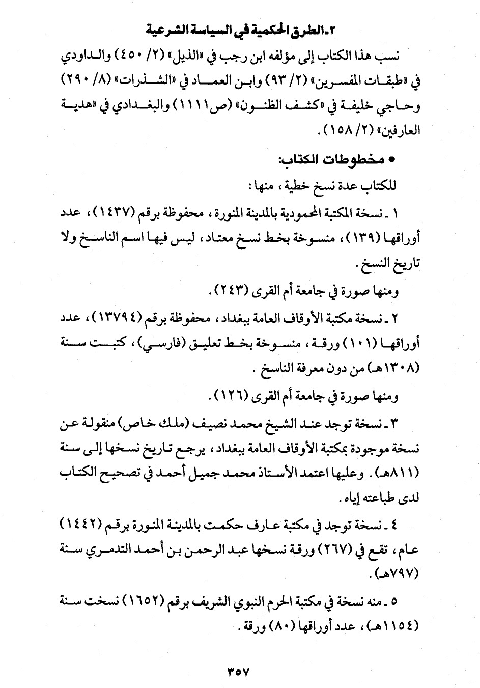 4 - نسخة توجد في مكتبة عارف حكمت بالمدينة المنورة برقم (1442) عام, تقع في (267) ورقة نسخها عبد الرحمن بن أحمد التدمري سنة (797 هـ).