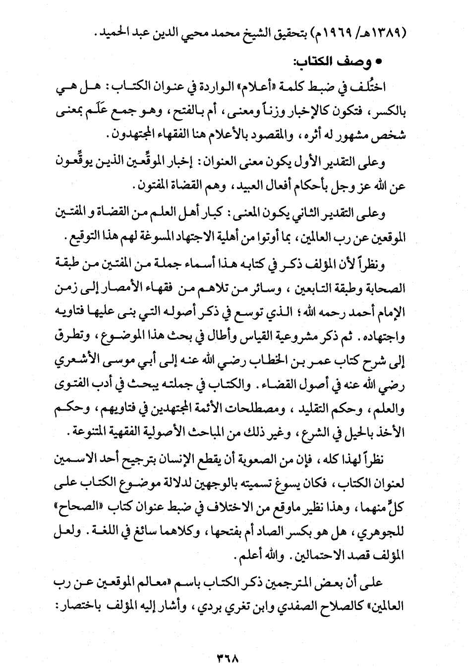 اختُلف في ضبط كلمة "أعلام" الواردة في عنوان الكتاب: هل هي بالكسر، فتكون كالإخبار وزناً ومعنى، أم بالفتح، وهو جمع عَلَم بمعنى شخص مشهور له أثره، والمقصود بالأعلام هنا الفقهاء المجتهدون.