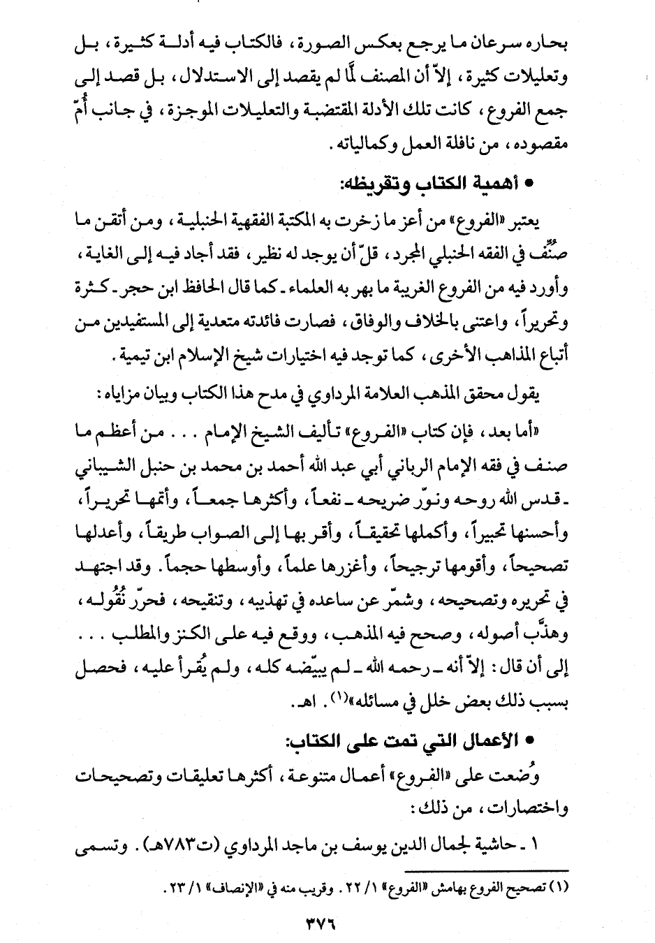 "أما بعد، فإن كتاب "الفروع" تأليف الشيخ الإمام ... من أعظم ما صنف في فقه الإمام الرباني أبي عبد الله أحمد بن محمد بن حنبل الشيباني -قدس الله روحه ونوَّر ضريحه- نفعاً، وأكثرها جمعاً، وأتمها تحريراً، وأحسنها تحبيراً، وأكملها تحقيقاً، وأقربها إلى الصواب طريقًا، وأعدلها تصحيحًا، وأقومها ترجيحًا، وأغزرها علماً، وأوسطها حجماً. وقد اجتهد في تحريره وتصحيحه، وشمر عن ساعده في تهذيبه، وتنقيحه، فحرر نُقُوله، وهذَّب أصوله، وصحح فيه المذهب، ووقع فيه على الكنز والمطلب ... إلى أن قال: إلا أنه -رَحِمَهُ اللهُ- لم يبيضه كله، ولم يُقرأ عليه، فحصل بسبب ذلك بعض خلل في مسائله" (¬1).اهـ.