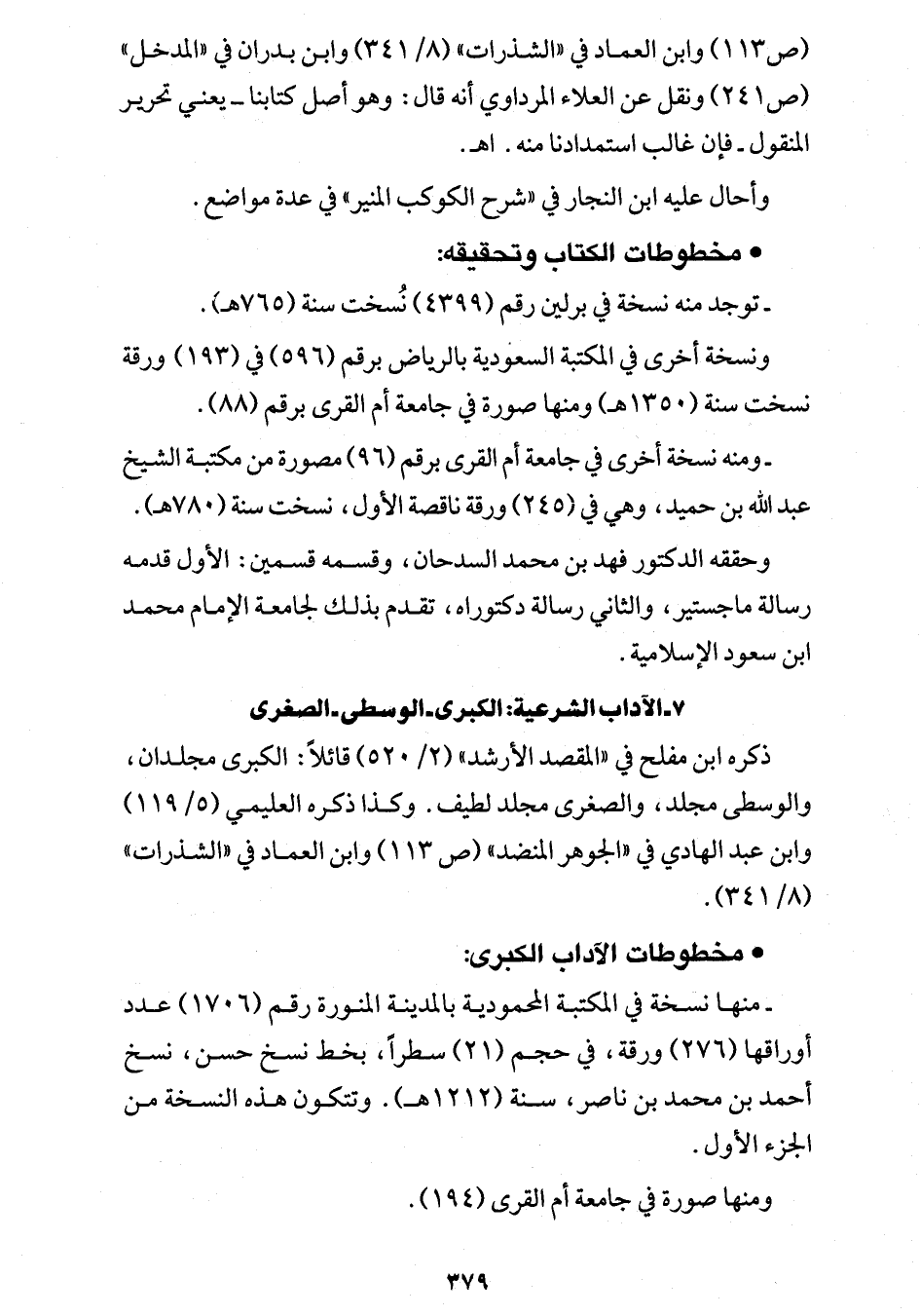 (ص 113) وابن العماد في "الشذرات" (8/ 341) وابن بدران في "المدخل" (ص 241) ونقل عن العلاء المرداوي أنه قال: وهو أصل كتابنا -يعني تحرير المنقول- فإن غالب استمدادنا منه. اهـ.
