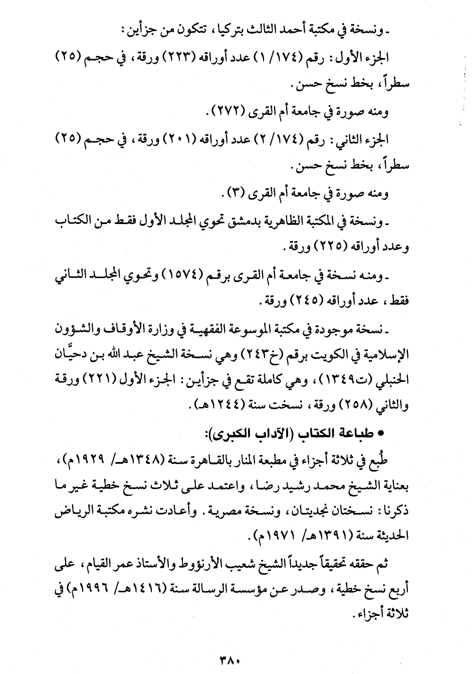 - ومنه نسخة في جامعة أم القرى برقم (1574) وتحوي المجلد الثاني فقط، عدد أوراقه (245) ورقة.