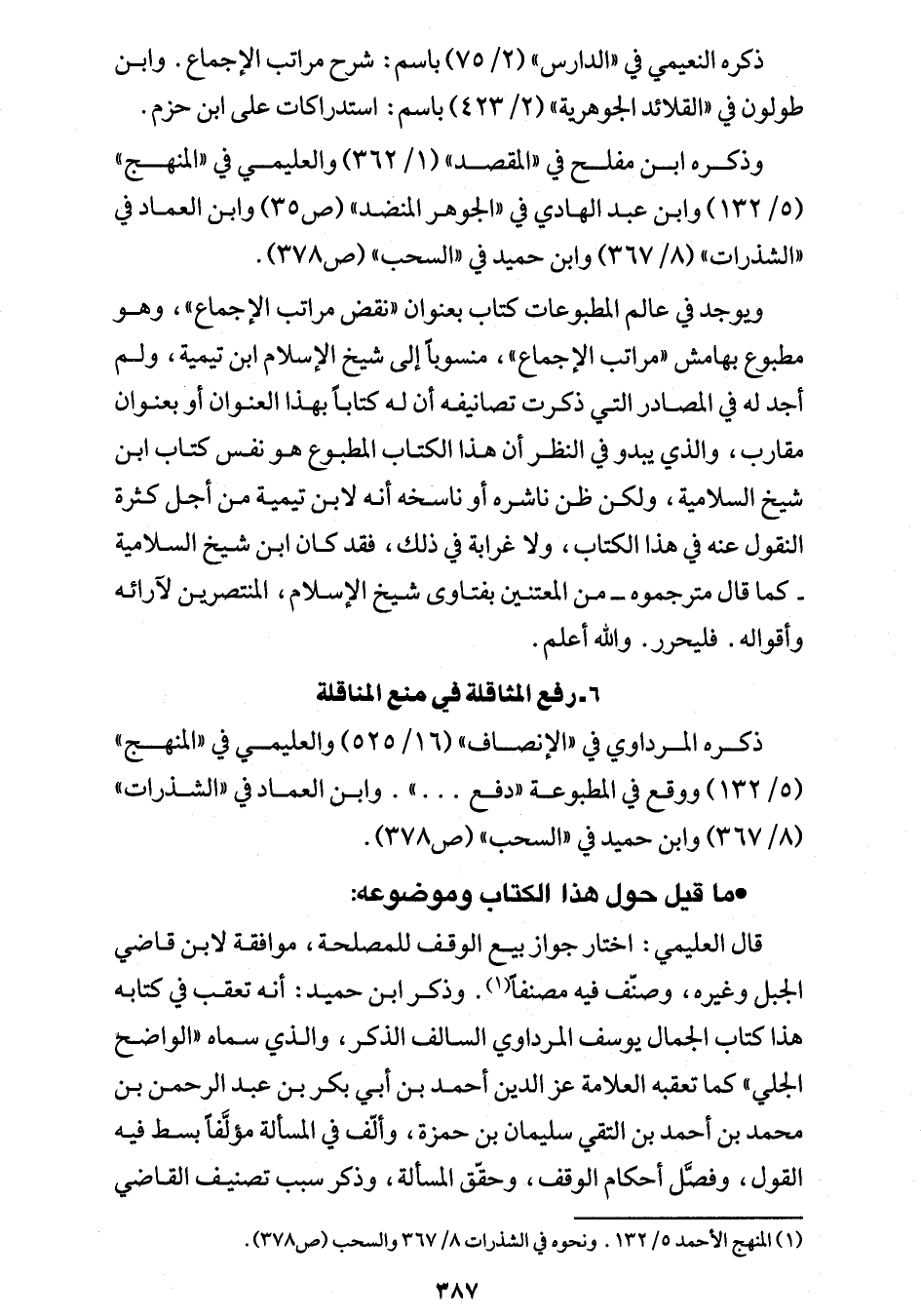 قال العليمي: اختار جواز بيع الوقف للمصلحة، موافقة لإبن قاضي الجبل وغيره، وصنف فيه مصنفاً (¬1). وذكر ابن حميد: أنه تعقب في كتابه هذا كتاب الجمال يوسف المرداوي السالف الذكر، والذي سماه "الواضح الجلي" كما تعقبه العلامة عز الدين أحمد بن أبي بكر بن عبد الرحمن بن محمد بن أحمد بن التقي سليمان بن حمزة، وألّف في المسألة مؤلَّفاً بسط فيه القول، وفصَّل أحكام الوقف، وحقق المسألة، وذكر سبب تصنيف القاضي