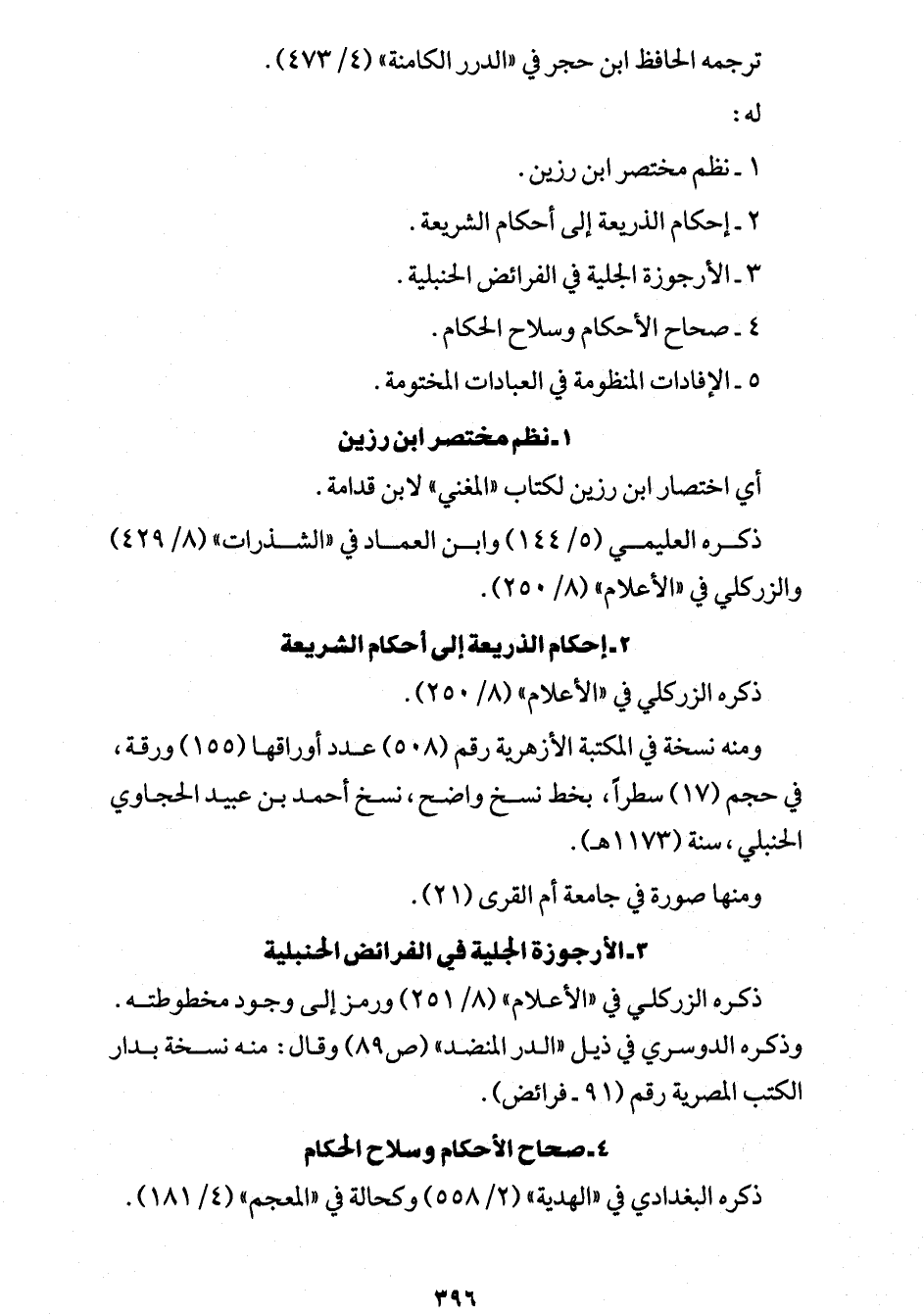 ذكره الزركلي في "الأعلام" (8/ 251) ورمز إلى وجود مخطوطته. وذكره الدوسري في ذيل "الدر المنضد" (ص 89) وقال: منه نسخة بدار الكتب المصرية رقم (91 - فرائض).
