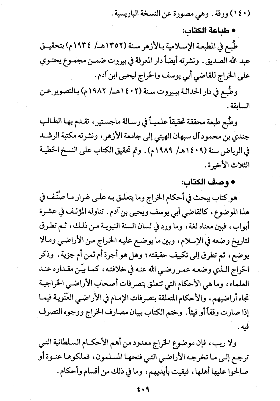 هو كتاب يبحث في أحكام الخراج وما يتعلق به على غرار ما صُنّف في هذا الموضوع، كالقاضي أبي يوسف ويحيى بن آدم. تناوله المؤلف في عشرة أبواب، فبين معناه لغة، وما ورد في لسان السنة النبوية من ذلك، ثم تطرق لتاريخ وضعه في الإسلام، وبين ما يوضع عليه الخراج من الأراضي ومالا يوضع، ثم تطرق إلى تكييف حقيقته؛ وهل هو أجرة أم ثمن أم جزية. وذكر الخراج الذي وضعه عمر - رضي الله عنه - في خلافته، كما بيّن مقداره عند العلماء، وما هي الأحكام التي تتعلق بتصرفات أصحاب الأراضي الخراجية تجاه أراضيهم، والأحكام المتعلقة بتصرفات الإمام في الأراضي العَنَوية فيما إذا صارت وقفاً أو فيئاً. وختم الكتاب ببيان مصارف الخراج ووجوه التصرف فيه.