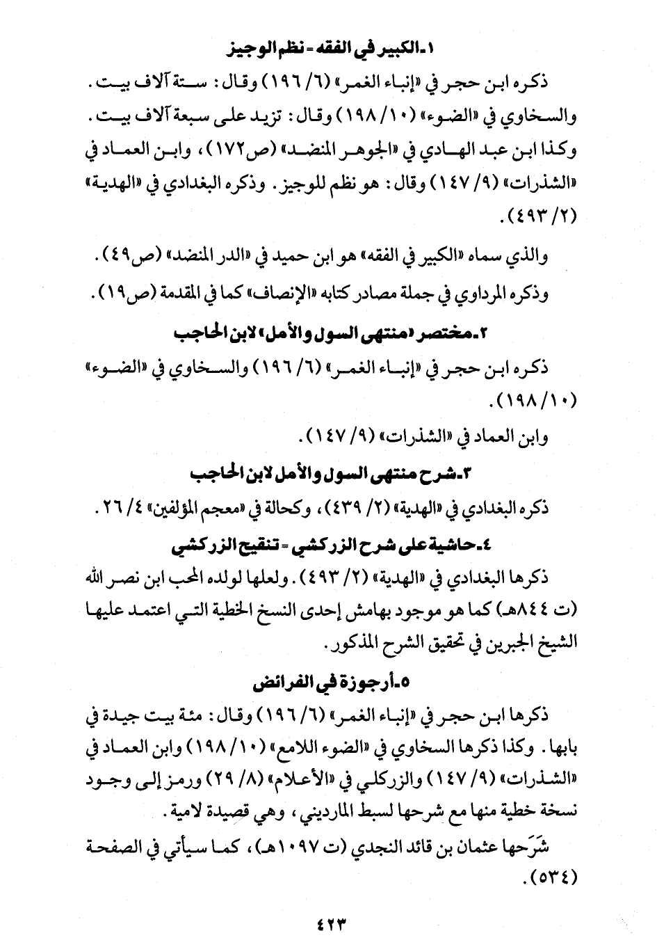 ذكره ابن حجر في "إنباء الغمر" (6/ 196) وقال: ستة آلاف بيت. والسخاوي في "الضوء" (10/ 198) وقال: تزيد على سبعة آلاف بيت. وكذا ابن عبد الهادي في "الجوهر المنضد" (ص 172)، وابن العماد في "الشذرات" (9/ 147) وقال: هو نظم للوجيز. وذكره البغدادي في "الهدية" (2/ 493).