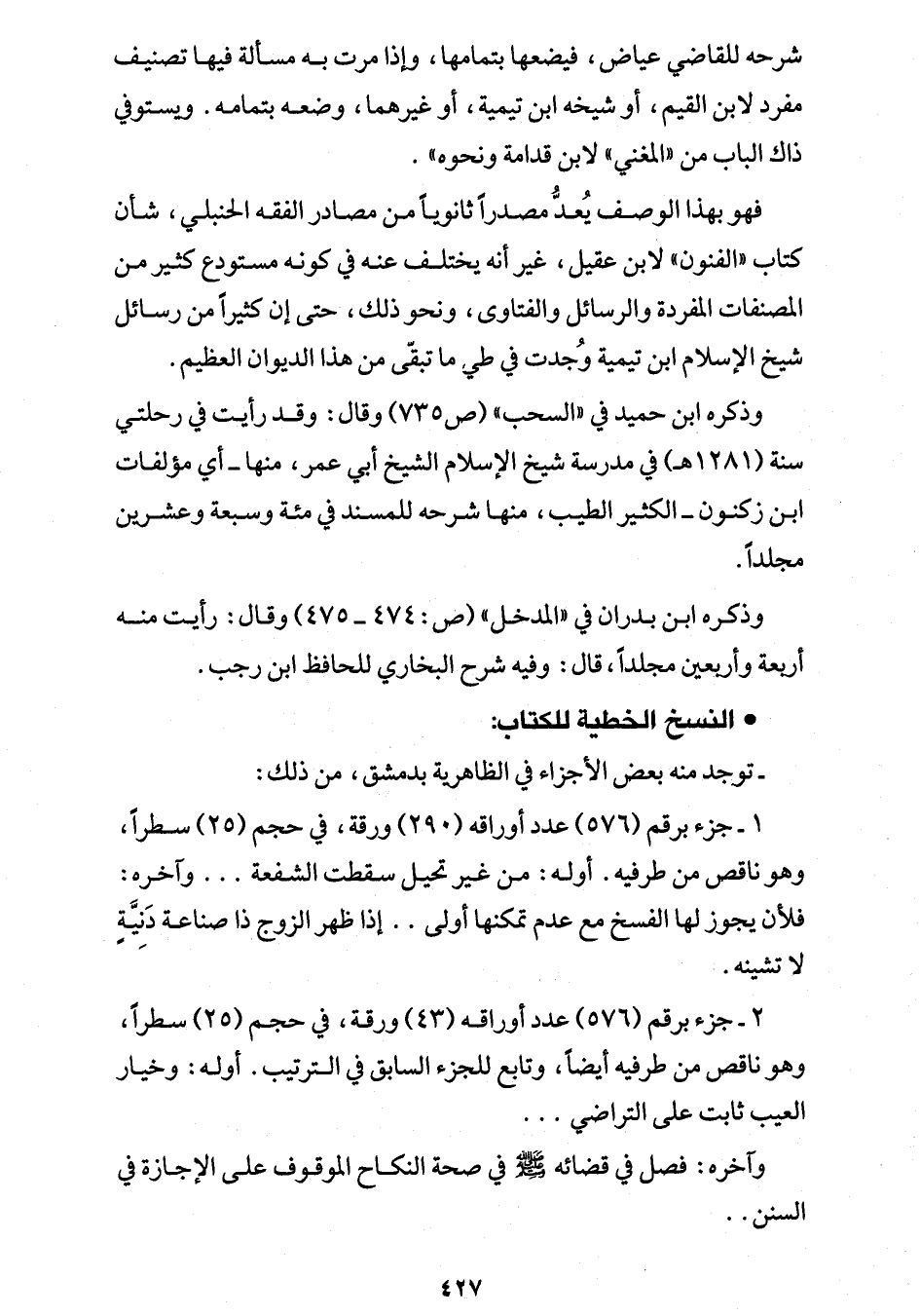 1 - جزء برقم (576) عدد أوراقه (290) ورقة، في حجم (25) سطرًا، وهو ناقص من طرفيه. أوله: من غير تحيل سقطت الشفعة ... وآخره: فلأن يجوز لها الفسخ مع عدم تمكنها أولى .. إذا ظهر الزوج ذا صناعة دَنِيَّةِ لا تشينه.