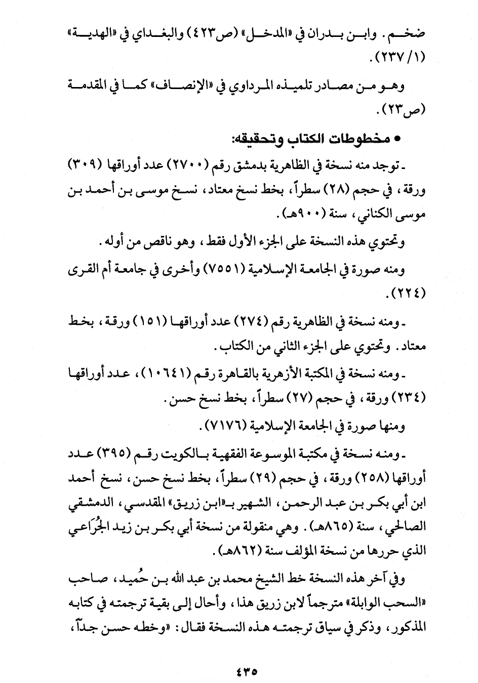 - ومنه نسخة في مكتبة الموسوعة الفقهية بالكويت رقم (395) عدد أوراقها (258) ورقة، في حجم (29) سطرًا، بخط نسخ حسن، نسخ أحمد ابن أبي بكر بن عبد الرحمن، الشهير بـ "ابن زريق، القدسي، الدمشقي الصالحي، سنة (865 هـ). وهي منقولة من نسخة أبي بكر بن زيد الجُرَاعي الذي حررها من نسخة المؤلف سنة (862 هـ).