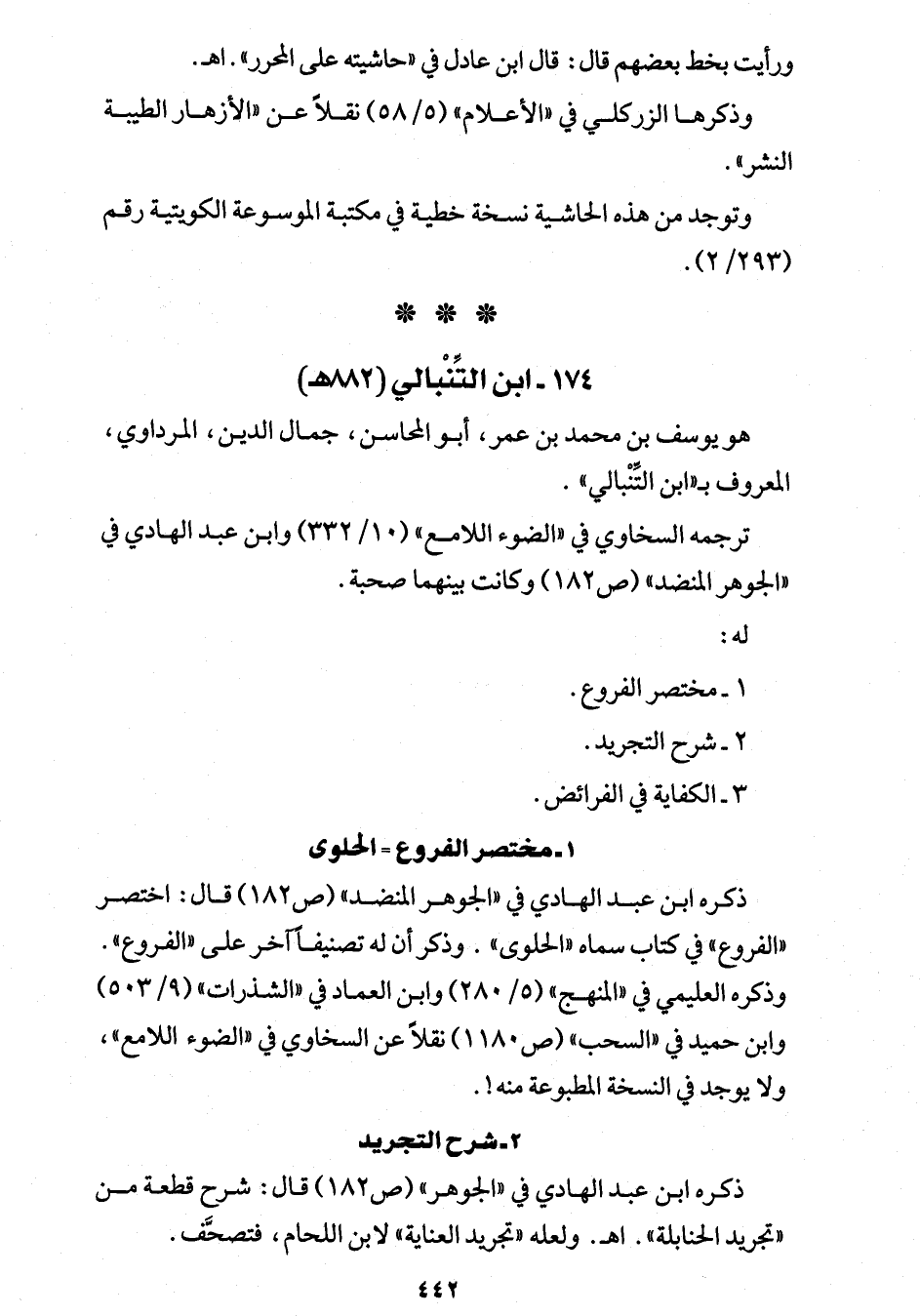 ذكره ابن عبد الهادي في "الجوهر المنضد" (ص 182) قال: اختصر "الفروع" في كتاب سماه "الحلوى". وذكر أن له تصنيفًا آخر على "الفروع". وذكره العليمي في "المنهج" (5/ 285) وابن العماد في "الشذرات" (9/ 503) وابن حميد في "السحب" (ص 1180) نقلًا عن السخاوي في "الضوء اللامع". ولا يوجد في النسخة المطبوعة منه!.
