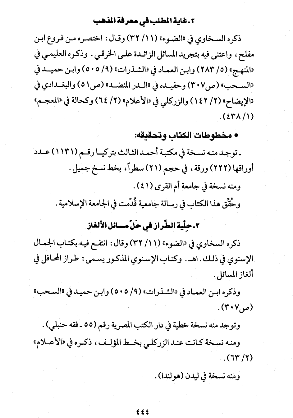 ذكره السخاوي في "الضوء" (11/ 32) وقال: اختصره من فروع ابن مفلح، واعتنى فيه بتجريد المسائل الزائدة على الخرقي. وذكره العليمي في "المنهج" (5/ 283) وابن العماد في "الشذرات" (9/ 505) وابن حميد في "السحب" (ص 307) وحفيده في "الدر المنضد" (ص 51) والبغدادي في "الإيضاح" (2/ 142) والزركلي في "الأعلام" (2/ 64) وكحالة في "المعجم" (1/ 438).