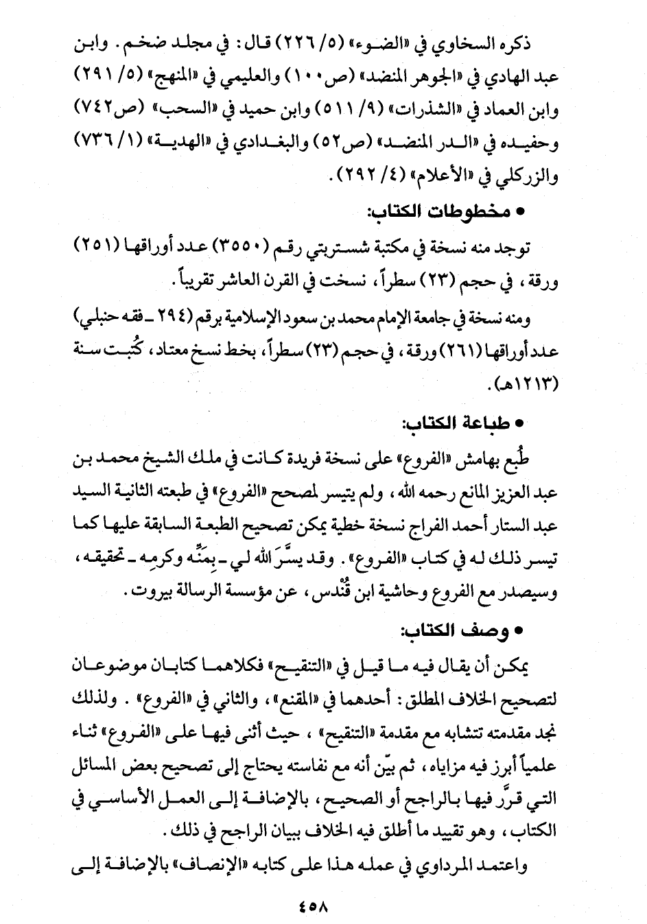 طبع بهامش "الفروع" على نسخة فريدة كانت في ملك الشيخ محمد بن عبد العزيز المانع -رَحِمَهُ اللهُ-، ولم يتيسر لمصحح "الفروع" في طبعته الثانية السيد عبد الستار أحمد الفراج نسخة خطبة يمكن تصحيح الطبعة السابقة عليها كما تيسر ذلك له في كتاب "الفروع". وقد يسَّرَ الله لي -بِمَنِّه وكرمِه- تحقيقه، وسيصدر مع الفروع وحاشية ابن قُنْدس، عن مؤسسة الرسالة بيروت.