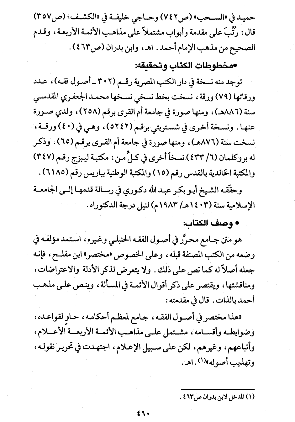 حميد في "السحب" (ص 742) وحاجي خليفة في "الكشف" (ص 357) قال: رُتِّب على مقدمة وأبواب مشتملًا على مذاهب الأئمة الأربعة، وقدم الصحيح من مذهب الإمام أحمد. اهـ، وابن بدران (ص 463).