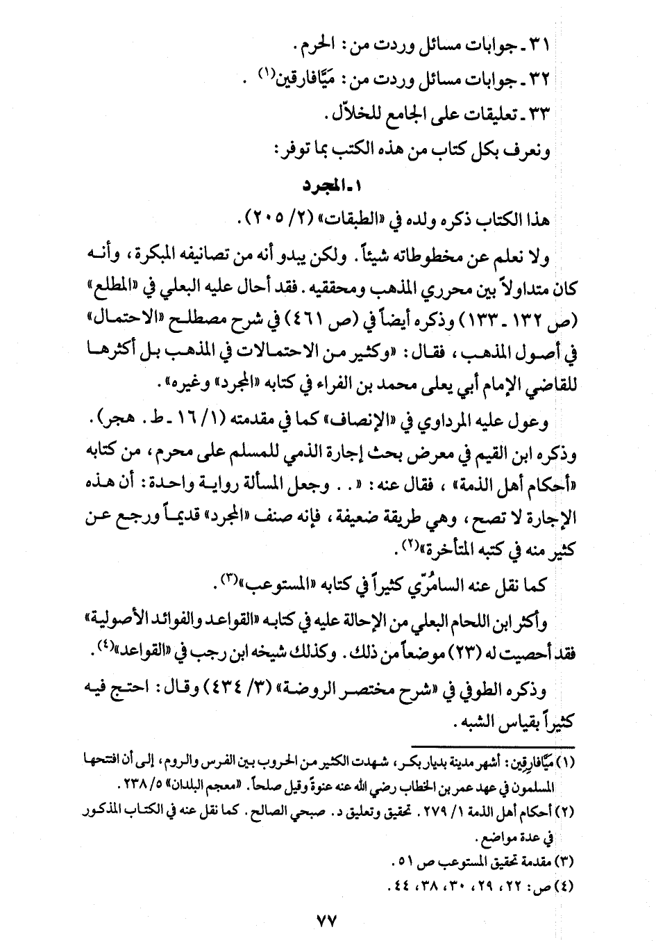 وعول عليه المرداوي في "الإنصاف" كما في مقدمته (1/ 16 - ط. هجر). وذكره ابن القيم في معرض بحث إجارة الذمي للمسلم على محرم، من كتابه "أحكام أهل الذمة"، فقال عنه: ". . وجعل المسألة رواية واحدة: أن هذه الإجارة لا تصح، وهي طريقة ضعيفة، فإنه صنف "المجرد" قديمًا ورجع عن كثير منه في كتبه المتأخرة" (¬2).