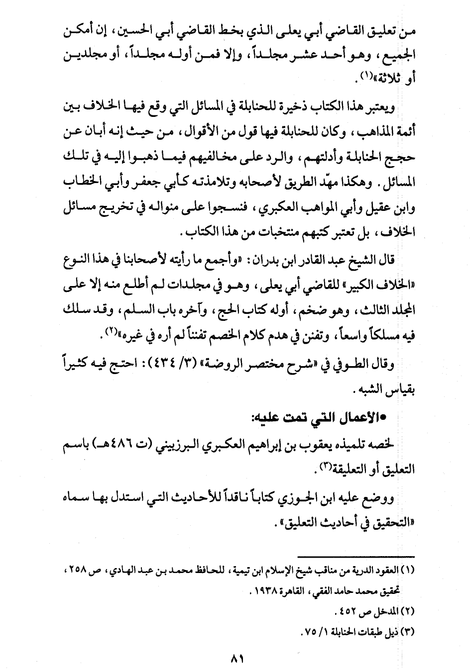 قال الشيخ عبد القادر ابن بدران: "وأجمع ما رأيته لأصحابنا في هذا النوع "الخلاف الكبير" للقاضي أبي يعلى، وهو في مجلدات لم أطلع منه إلا على المجلد الثالث، وهو ضخم، أوله كتاب الحج، وآخره باب السلم، وقد سلك فيه مسلكًا واسعًا، وتفنن في هدم كلام الخصم تفننًا لم أره في غيره" (¬2).