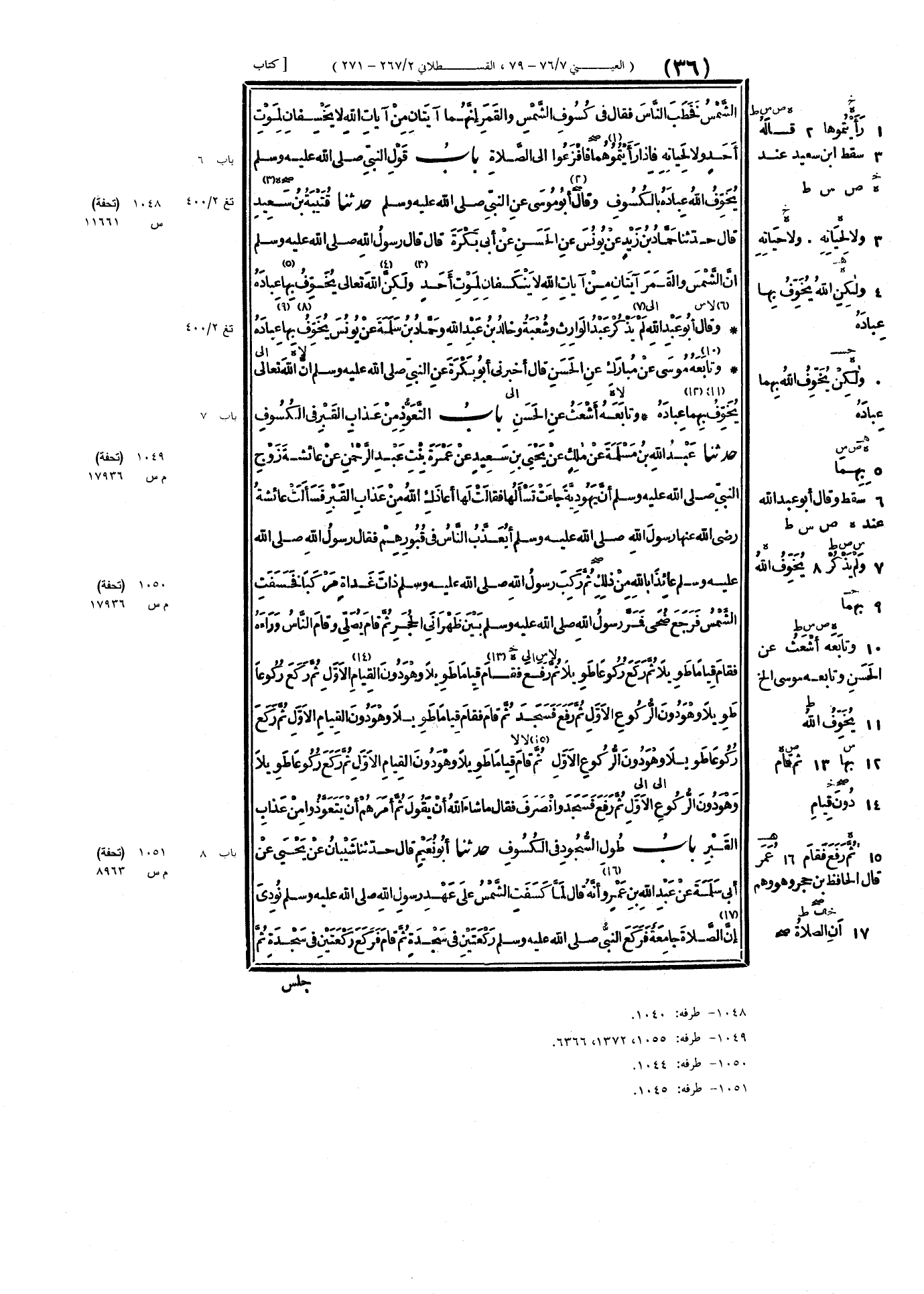 ١٠٥٠ - ثُمَّ رَكِبَ رَسُولُ اللَّهِ صَلَّى اللهُ عَلَيْهِ وَسَلَّمَ ذَاتَ غَدَاةٍ مَرْكَبًا، فَخَسَفَتِ الشَّمْسُ، فَرَجَعَ ضُحًى، فَمَرَّ رَسُولُ اللَّهِ صَلَّى اللهُ عَلَيْهِ وَسَلَّمَ بَيْنَ ظَهْرَانَيِ الحُجَرِ، ثُمَّ قَامَ يُصَلِّي وَقَامَ النَّاسُ وَرَاءَهُ، فَقَامَ قِيَامًا طَوِيلًا، ثُمَّ رَكَعَ رُكُوعًا طَوِيلًا، ثُمَّ رَفَعَ فَقَامَ قِيَامًا طَوِيلًا وَهُوَ دُونَ القِيَامِ الأَوَّلِ، ثُمَّ رَكَعَ رُكُوعًا طَوِيلًا وَهُوَ دُونَ الرُّكُوعِ الأَوَّلِ، ثُمَّ رَفَعَ، فَسَجَدَ، ثُمَّ قَامَ فَقَامَ قِيَامًا طَوِيلًا وَهُوَ دُونَ القِيَامِ الأَوَّلِ، ثُمَّ رَكَعَ رُكُوعًا طَوِيلًا وَهُوَ دُونَ الرُّكُوعِ الأَوَّلِ، ثُمَّ قَامَ قِيَامًا طَوِيلًا وَهُوَ دُونَ القِيَامِ الأَوَّلِ، ثُمَّ رَكَعَ رُكُوعًا طَوِيلًا وَهُوَ دُونَ الرُّكُوعِ الأَوَّلِ، ثُمَّ رَفَعَ، فَسَجَدَ وَانْصَرَفَ، فَقَالَ مَا شَاءَ اللَّهُ أَنْ يَقُولَ، ثُمَّ أَمَرَهُمْ أَنْ يَتَعَوَّذُوا مِنْ عَذَابِ القَبْرِ