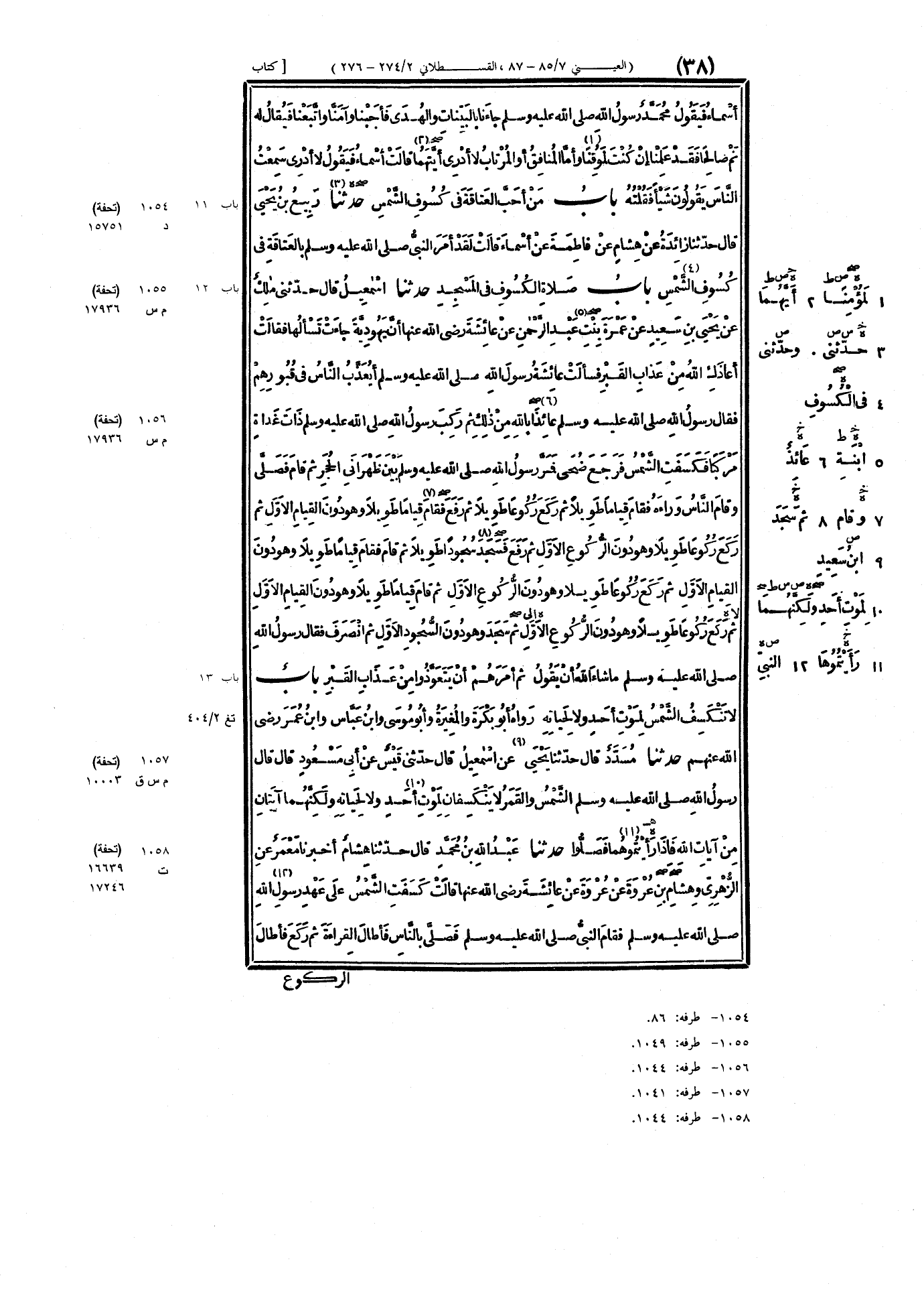 ١٠٥٦ - ثُمَّ رَكِبَ رَسُولُ اللَّهِ صَلَّى اللهُ عَلَيْهِ وَسَلَّمَ ذَاتَ غَدَاةٍ مَرْكَبًا، فَكَسَفَتِ الشَّمْسُ، فَرَجَعَ ضُحًى، فَمَرَّ رَسُولُ اللَّهِ صَلَّى اللهُ عَلَيْهِ وَسَلَّمَ بَيْنَ ظَهْرَانَيِ الحُجَرِ، ثُمَّ قَامَ، فَصَلَّى وَقَامَ النَّاسُ وَرَاءَهُ، فَقَامَ قِيَامًا طَوِيلًا، ثُمَّ رَكَعَ رُكُوعًا طَوِيلًا، ثُمَّ رَفَعَ، فَقَامَ قِيَامًا طَوِيلًا وَهُوَ دُونَ القِيَامِ الأَوَّلِ، ثُمَّ رَكَعَ رُكُوعًا طَوِيلًا وَهُوَ دُونَ الرُّكُوعِ الأَوَّلِ، ثُمَّ رَفَعَ، فَسَجَدَ سُجُودًا طَوِيلًا، ثُمَّ قَامَ، فَقَامَ قِيَامًا طَوِيلًا وَهُوَ دُونَ القِيَامِ الأَوَّلِ، ثُمَّ رَكَعَ رُكُوعًا طَوِيلًا وَهُوَ دُونَ الرُّكُوعِ الأَوَّلِ، ثُمَّ قَامَ قِيَامًا طَوِيلًا وَهُوَ دُونَ القِيَامِ الأَوَّلِ، ثُمَّ رَكَعَ رُكُوعًا طَوِيلًا وَهُوَ دُونَ الرُّكُوعِ الأَوَّلِ، ثُمَّ سَجَدَ وَهُوَ دُونَ السُّجُودِ الأَوَّلِ، ثُمَّ انْصَرَفَ، فَقَالَ رَسُولُ اللَّهِ صَلَّى اللهُ عَلَيْهِ وَسَلَّمَ مَا شَاءَ اللَّهُ أَنْ يَقُولَ ثُمَّ «أَمَرَهُمْ أَنْ يَتَعَوَّذُوا مِنْ عَذَابِ القَبْرِ»