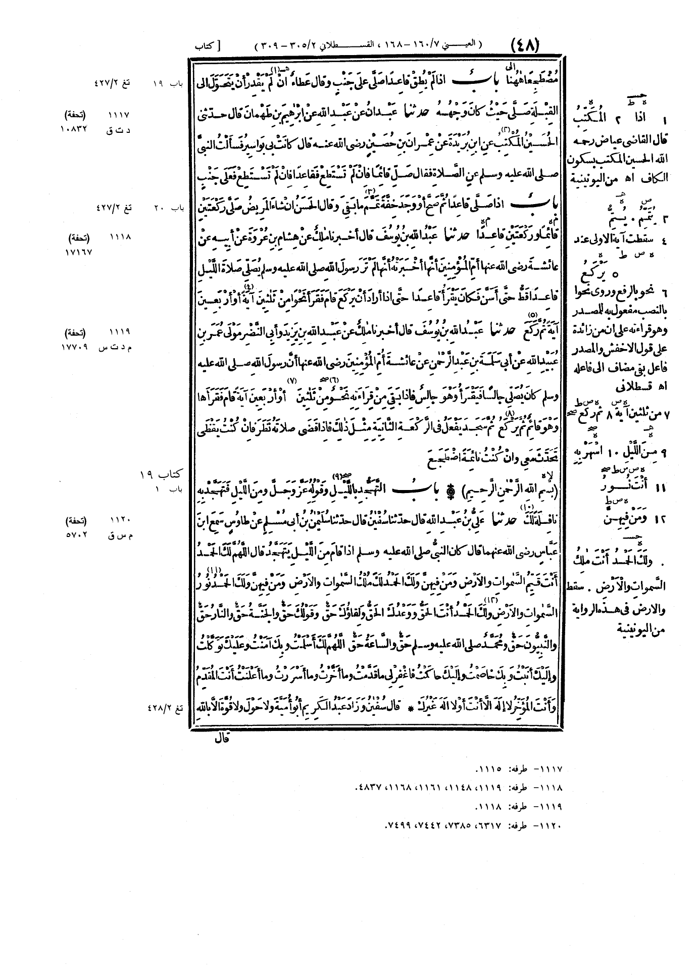 ١١٢٠ - حَدَّثَنَا عَلِيُّ بْنُ عَبْدِ اللَّهِ، قَالَ: حَدَّثَنَا سُفْيَانُ، قَالَ: حَدَّثَنَا سُلَيْمَانُ بْنُ أَبِي مُسْلِمٍ، عَنْ طَاوُسٍ، سَمِعَ ابْنَ عَبَّاسٍ رَضِيَ اللَّهُ عَنْهُمَا، قَالَ: كَانَ النَّبِيُّ صَلَّى اللهُ عَلَيْهِ وَسَلَّمَ إِذَا قَامَ مِنَ اللَّيْلِ يَتَهَجَّدُ قَالَ: " اللَّهُمَّ لَكَ الحَمْدُ أَنْتَ قَيِّمُ السَّمَوَاتِ وَالأَرْضِ وَمَنْ فِيهِنَّ، وَلَكَ الحَمْدُ لَكَ مُلْكُ السَّمَوَاتِ وَالأَرْضِ وَمَنْ فِيهِنَّ، وَلَكَ الحَمْدُ أَنْتَ نُورُ السَّمَوَاتِ وَالأَرْضِ وَمَنْ فِيهِنَّ، وَلَكَ الحَمْدُ أَنْتَ مَلِكُ السَّمَوَاتِ وَالأَرْضِ، وَلَكَ الحَمْدُ أَنْتَ الحَقُّ وَوَعْدُكَ الحَقُّ، وَلِقَاؤُكَ حَقٌّ، وَقَوْلُكَ حَقٌّ، وَالجَنَّةُ حَقٌّ، وَالنَّارُ حَقٌّ، وَالنَّبِيُّونَ حَقٌّ، وَمُحَمَّدٌ صَلَّى اللهُ عَلَيْهِ وَسَلَّمَ حَقٌّ، وَالسَّاعَةُ حَقٌّ، اللَّهُمَّ لَكَ أَسْلَمْتُ، وَبِكَ آمَنْتُ، وَعَلَيْكَ تَوَكَّلْتُ، وَإِلَيْكَ أَنَبْتُ، وَبِكَ خَاصَمْتُ، وَإِلَيْكَ حَاكَمْتُ، فَاغْفِرْ لِي مَا قَدَّمْتُ وَمَا أَخَّرْتُ، وَمَا أَسْرَرْتُ وَمَا أَعْلَنْتُ، أَنْتَ المُقَدِّمُ، وَأَنْتَ المُؤَخِّرُ، لَا إِلَهَ إِلَّا أَنْتَ - أَوْ: لَا إِلَهَ غَيْرُكَ - " قَالَ سُفْيَانُ: وَزَادَ عَبْدُ الكَرِيمِ أَبُو أُمَيَّةَ: «وَلَا حَوْلَ وَلَا قُوَّةَ إِلَّا بِاللَّهِ» ⦗٤٩⦘، قَالَ سُفْيَانُ: قَالَ سُلَيْمَانُ بْنُ أَبِي مُسْلِمٍ: سَمِعَهُ مِنْ طَاوُسٍ، عَنْ ابْنِ عَبَّاسٍ رَضِيَ اللَّهُ عَنْهُمَا، عَنِ النَّبِيِّ صَلَّى اللهُ عَلَيْهِ وَسَلَّمَ