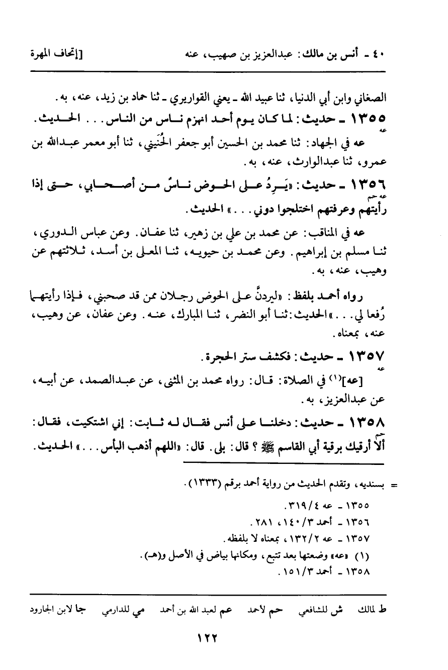 1356 - حَدِيثٌ (عه حم) : " يَرِدُ عَلَى الْحَوْضِ نَاسٌ مِنْ أَصْحَابِي، حَتَّى إِذَا رَأَيْتُهُمْ وَعَرَفْتُهُمُ اخْتَلَجُوا دُونِي ... " الْحَدِيثَ.