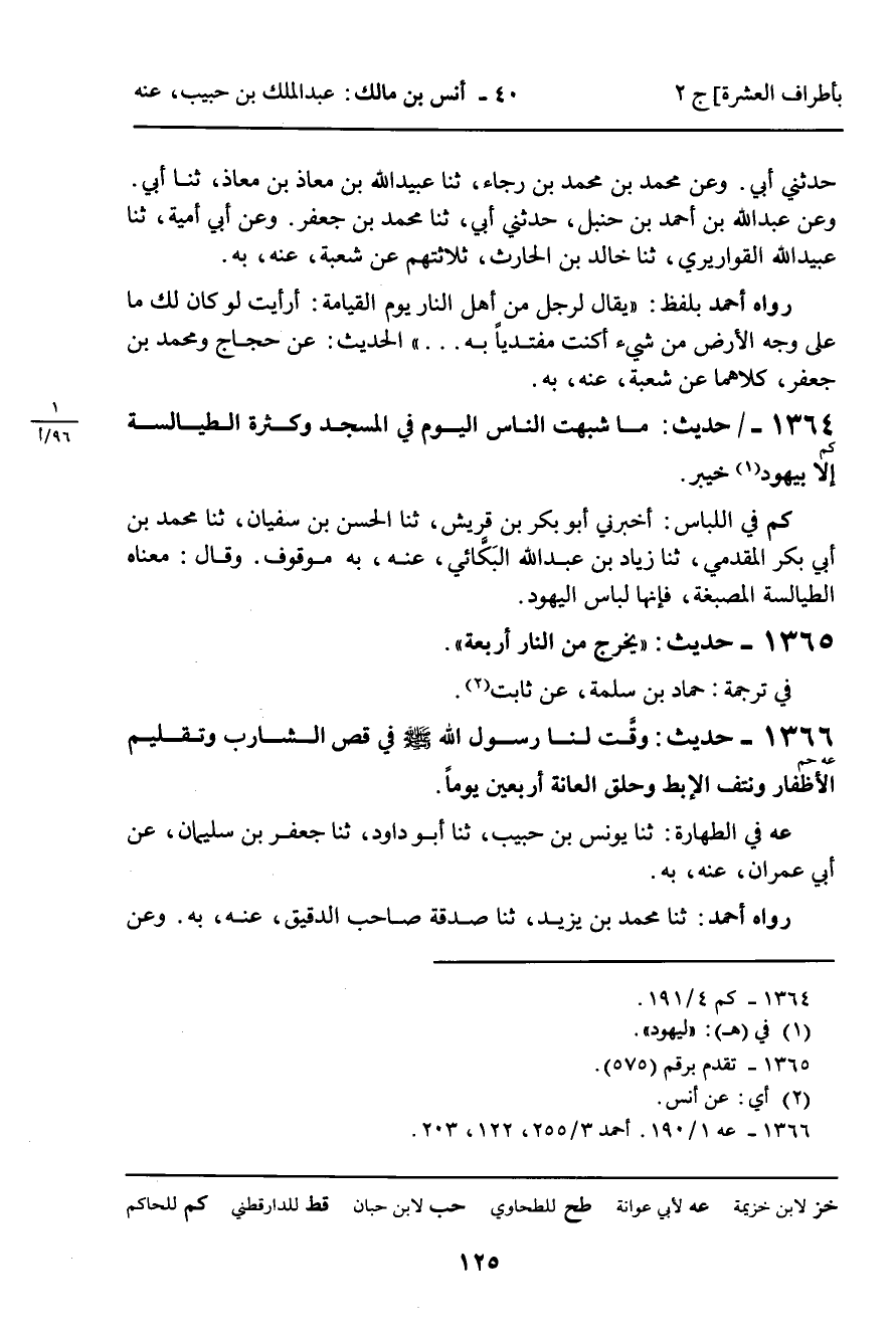 1364 - حَدِيثٌ (كم) : مَا شَبَّهْتُ النَّاسَ الْيَوْمَ فِي الْمَسْجِدِ وَكَثْرَةَ الطَّيَالِسَةِ إِلا بِيَهُودِ خَيْبَرَ.