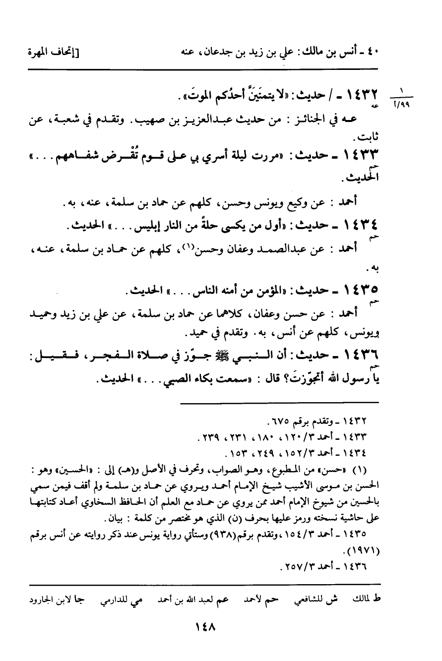 -[149]- أَحْمَدُ: ثنا عَفَّانُ، ثنا حَمَّادُ بْنُ زَيْدٍ، أنا عَلِيُّ بْنُ زَيْدٍ وَحُمَيْدٌ، عَنْ أَنَسٍ، بِهِ. قَالَ عَفَّانُ: وَجَدْتُهُ عِنْدِي، فِي غَيْرِ مَوْضِعٍ، عَنْ عَلِيٍّ وَحُمَيْدٍ وَثَابِتٍ، عَنْ أَنَسٍ.