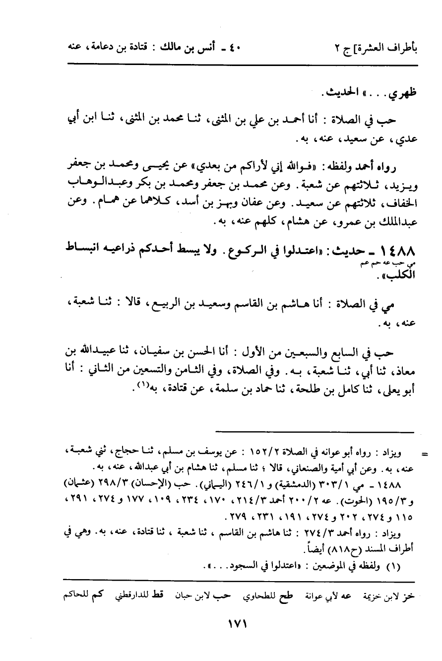 رَوَاهُ أَحْمَدُ: وَلَفْظُهُ: " اعْتَدِلُوا فِي السُّجُودِ ... " الْحَدِيثَ: عَنْ أَبِي عَامِرٍ عَبْدِ الْمَلِكِ بْنِ عَمْرٍو، عَنْ هِشَامٍ. وَعَنْ مُحَمَّدِ بْنِ بَكْرٍ وَيَزِيدَ وَمُحَمَّدِ بْنِ جَعْفَرٍ وَابْنِ أَبِي عَدِيٍّ وَعَبْدِ الْوَهَّابِ، كُلُّهُمْ عَنْ سَعِيدٍ. وَعَنْ مُحَمَّدِ بْنِ جَعْفَرٍ وَحَجَّاجٍ وَبَهْزٍ وَيَحْيَى وَوَكِيعٍ وَيَزِيدَ، كُلُّهُمْ عَنْ شُعْبَةَ، عَنْ بَهْزٍ، عَنْ هَمَّامٍ. وَعَنْ عَفَّانَ عَنْ يَزِيدَ بْنِ إِبْرَاهِيمَ. وَعَنْ مُحَمَّدِ بْنِ يَزِيدَ الْوَاسِطِيِّ، عَنْ أَيُّوبَ أَبِي الْعَلاءِ الْقَصَّابِ. كُلُّهُمْ عَنْهُ، بِهِ. وَفِي حَدِيثِ يَزِيدَ وَهَمَّامٍ " وَلا يَبْزُقْ أَحَدُكُمْ بَيْنَ يَدَيْهِ " وَحَدِيثُ أَيُّوبَ مُخْتَصَرٌ.