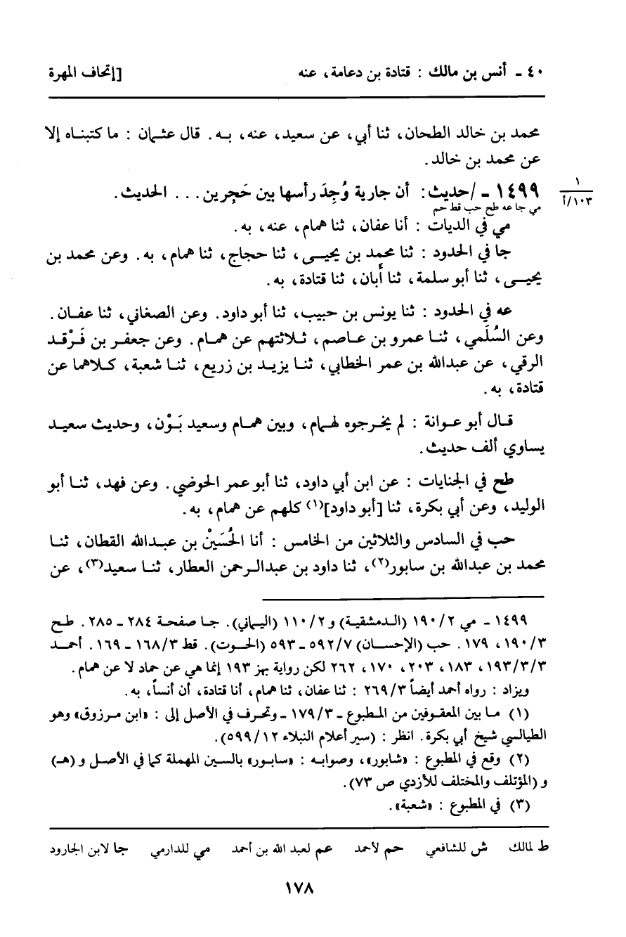 جا فِي الْحُدُودِ: ثنا مُحَمَّدُ بْنُ يَحْيَى، ثنا حَجَّاجٌ، ثنا هَمَّامٌ، بِهِ. وَعَنْ مُحَمَّدِ بْنِ يَحْيَى، ثنا أَبُو سَلَمَةَ، ثنا أَبَانٌ، ثنا قَتَادَةُ، بِهِ.