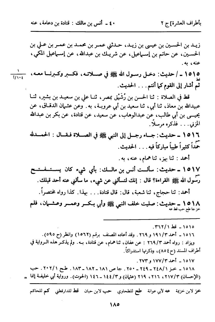 حب فِي الرَّابِعِ وَالثَّلاثِينَ مِنَ الْخَامِسِ، وَفِي الصَّلاةِ: أنا عُمَرُ بْنُ إِسْمَاعِيلَ بْنِ أَبِي غَيْلانَ وَالصُّوفِيُّ وَغَيْرُهُمَا، قَالُوا: ثنا عَلِيُّ بْنُ الْجَعْدِ، ثنا شُعْبَةُ وَشَيْبَانُ، قَالا: ثنا قَتَادَةُ، بِهِ. وَعَنْ مُحَمَّدِ بْنِ الْمُعَافَى الْعَابِدِ , ثَنا مُحَمَّدُ بْنُ هِشَامِ بْنِ أَبِي خَيْرَةَ، ثنا ابْنُ أَبِي عَدِيٍّ، ثنا حُمَيْدٌ وَسَعِيدٌ، بِهِ. وَعَنْ عَبْدِ اللَّهِ بْنِ قَحْطَبَةَ، ثنا الْعَبَّاسُ بْنُ عَبْدِ اللَّهِ، ثنا مُحَمَّدُ بْنُ يُوسُفَ، ثنا سُفْيَانُ، عَنْ سَعِيدٍ. وَعَنْ أَبِي خَلِيفَةَ،