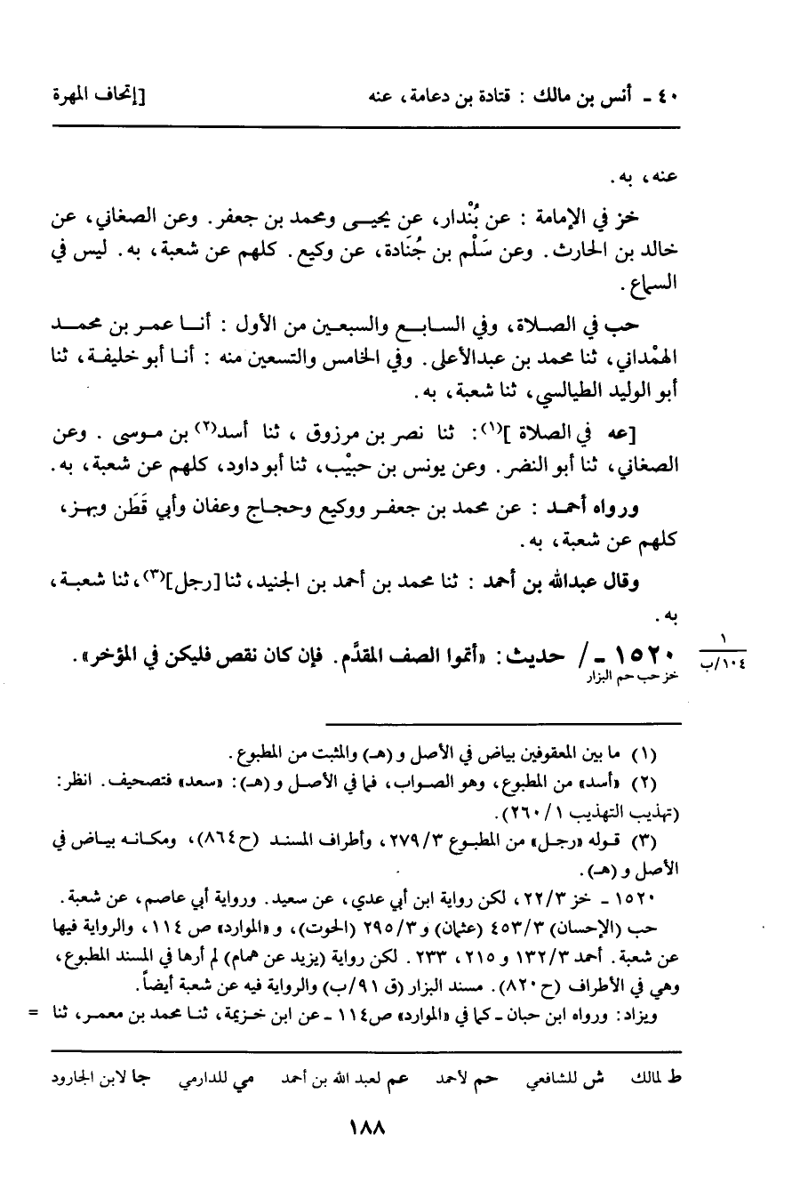 1520 - حَدِيثٌ (خز حب حم الْبَزَّارُ) : " أَتِمُّوا الصَّفَّ الْمُقَدَّمَ. فَإِنْ كَانَ نَقْصٌ فَلْيَكُنْ فِي الْمُؤَخَّرِ ".