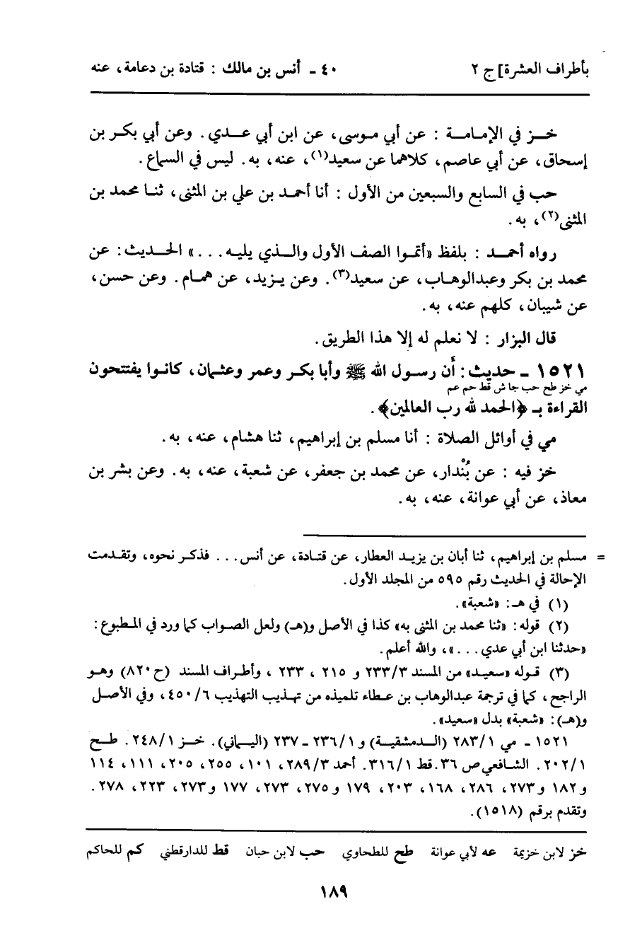 1521 - حَدِيثٌ (مي خز طح حب جا ش قط حم عم) : أَنَّ رَسُولَ اللَّهِ، صلى الله عليه وسلم، وَأَبَا بَكْرٍ وَعُمَرَ وَعُثْمَانَ، كَانُوا يَفْتَتِحُونَ الْقِرَاءَةَ بِـ الْحَمْدُ لِلَّهِ رَبِّ الْعَالَمِينَ [سورة: الفاتحة، آية 2] .