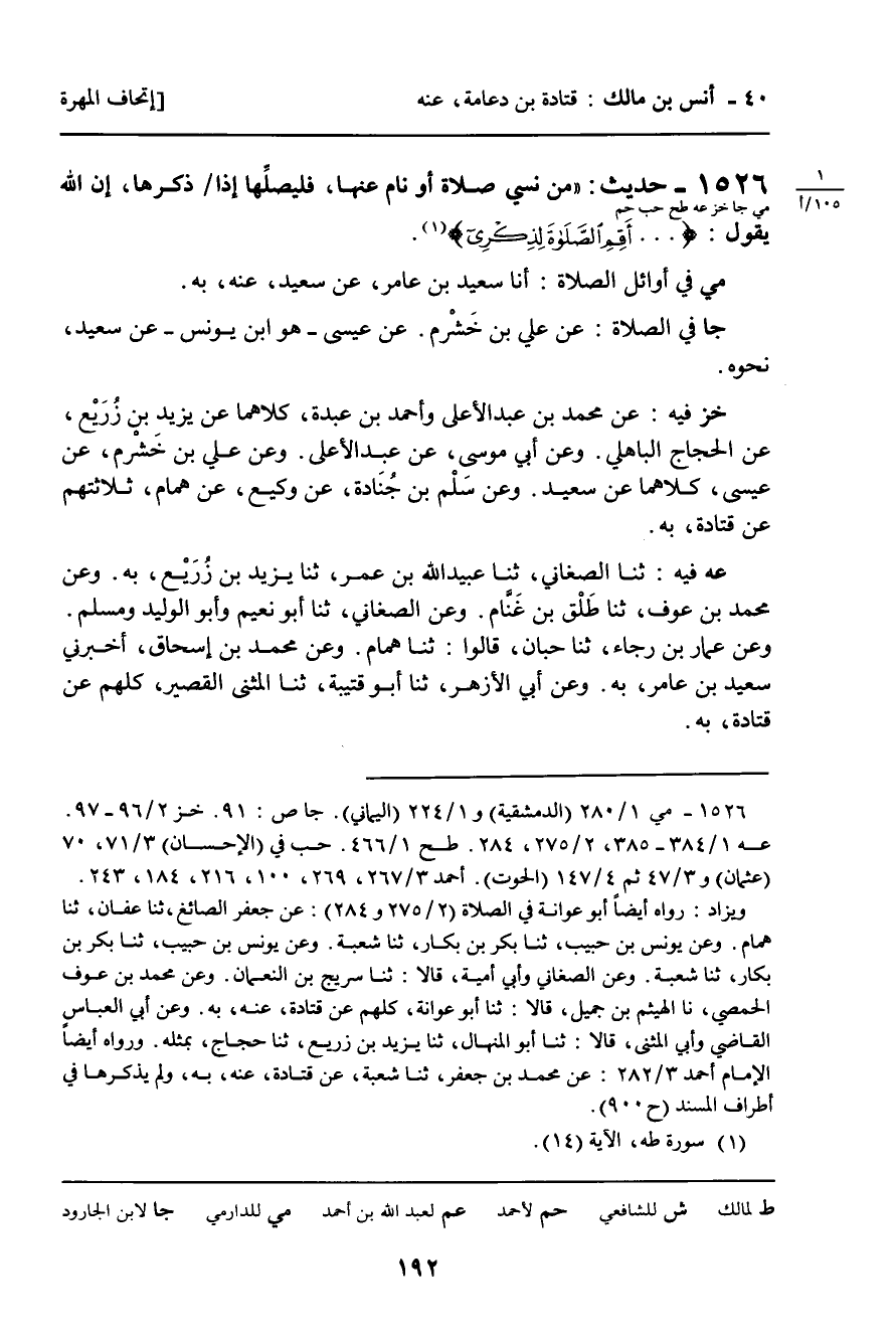 1526 - حَدِيثٌ (مي جا خز عه حب حم) : " مَنْ نَسِيَ صَلاةً أَوْ نَامَ عَنْهَا، فَلْيُصَلِّهَا إِذَا ذَكَرَهَا، إِنَّ اللَّهَ يَقُولُ: وَأَقِمِ الصَّلاةَ لِذِكْرِي [سورة: طه، آية 14]