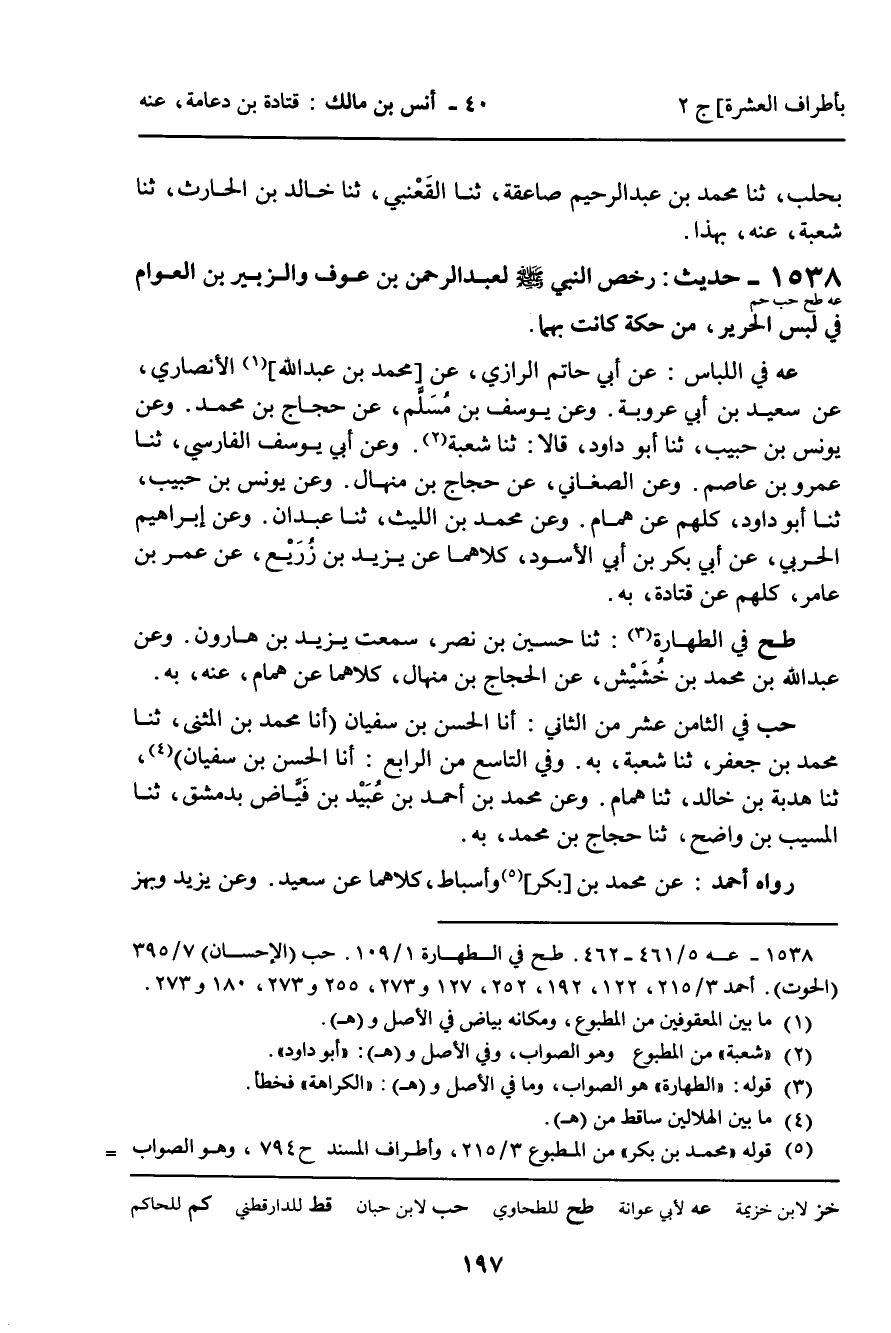 1538 - حَدِيثٌ (عه طح حب حم) : رَخَّصَ النَّبِيُّ، صلى الله عليه وسلم، لِعَبْدِ الرَّحْمَنِ بْنِ عَوْفٍ وَالزُّبَيْرِ بْنِ الْعَوَّامِ فِي لُبْسِ الْحَرِيرِ، مِنْ حَكَّةٍ كَانَتْ بِهِمَا.