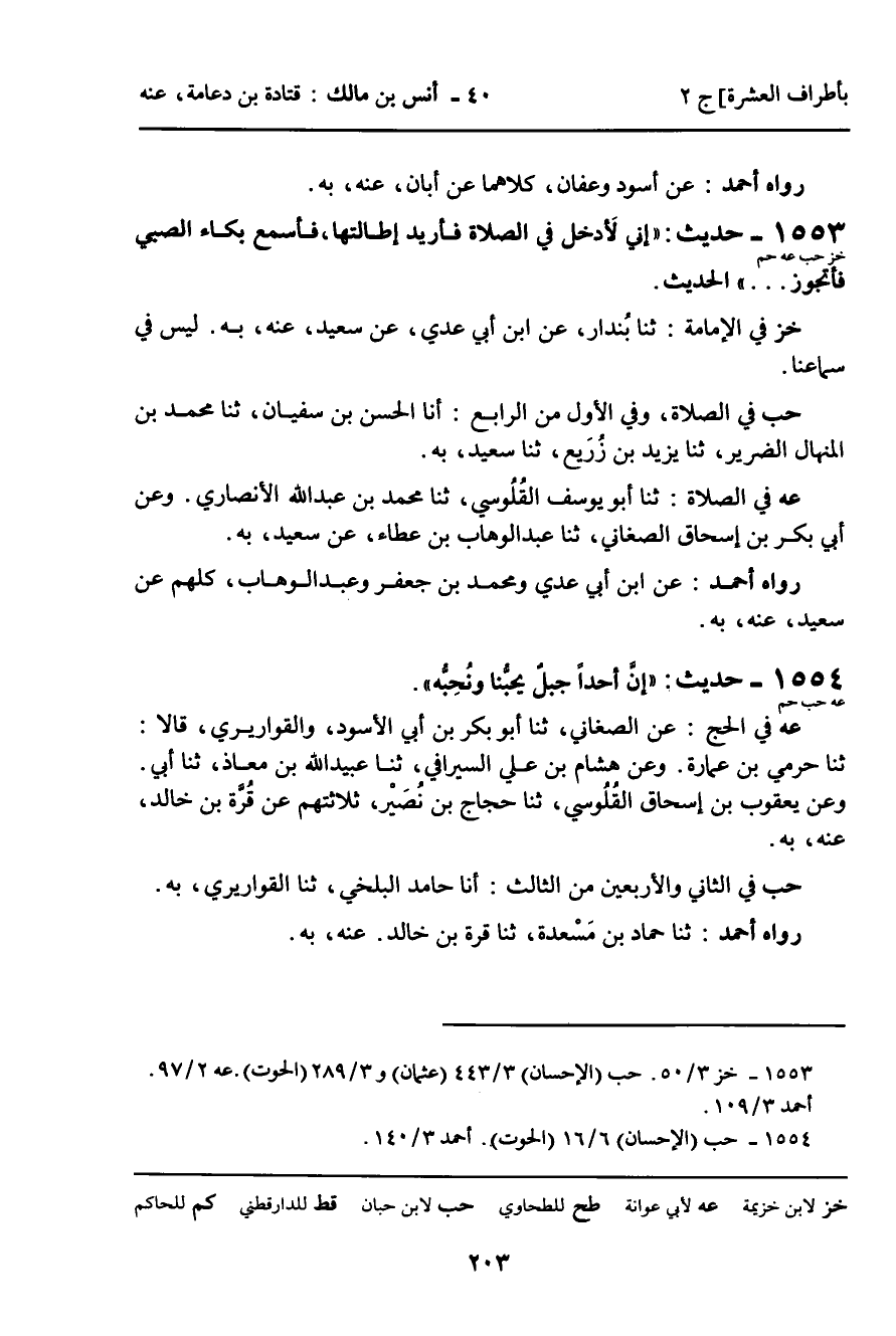 1553 - حَدِيثٌ (خز حب عه حم) : " إِنِّي لأَدْخُلُ فِي الصَّلاةِ فَأُرِيدُ إِطَالَتَهَا، فَأَسْمَعُ بُكَاءَ الصَّبِيِّ فَأَتَجَوَّزُ ... " الْحَدِيثَ.