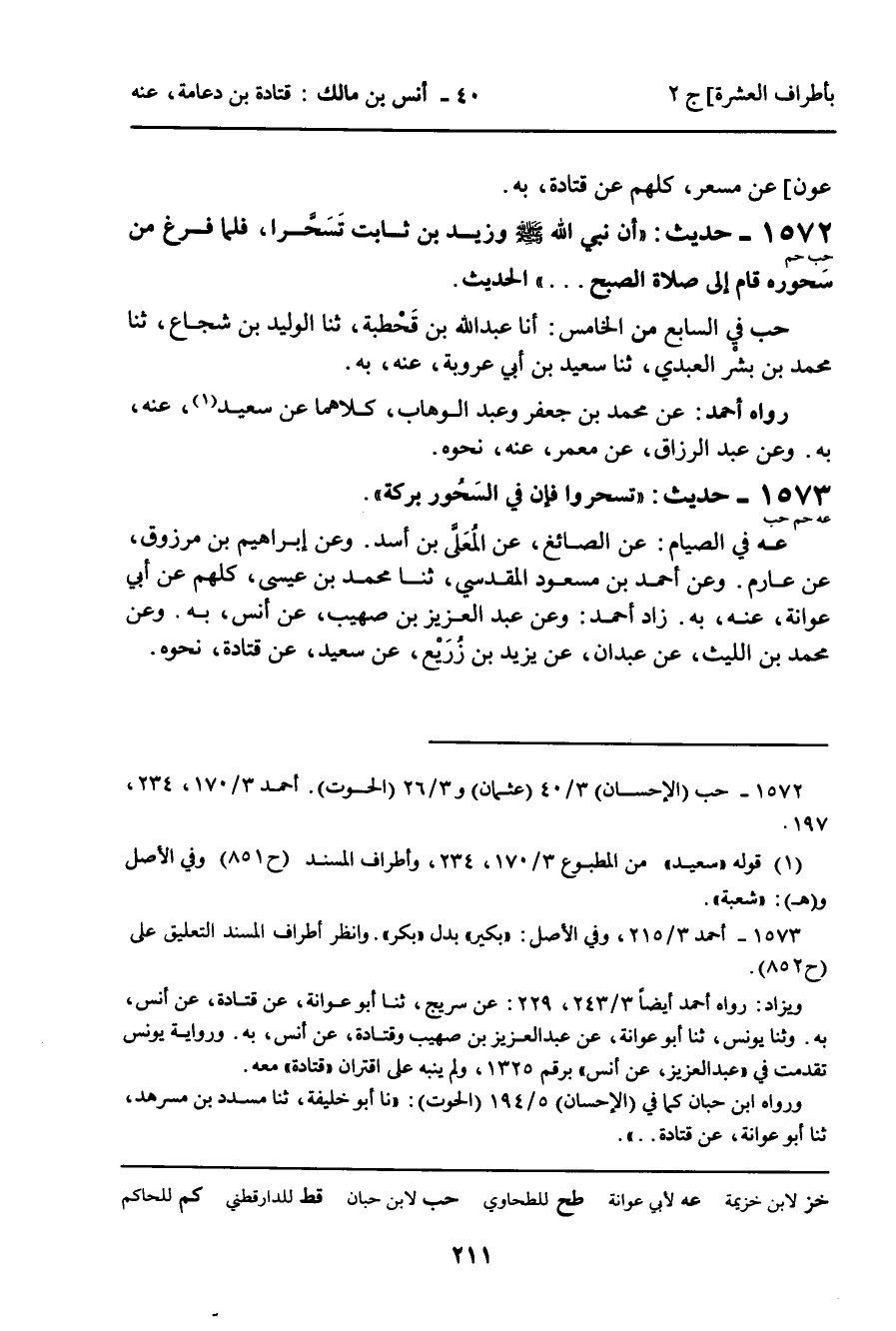 1572 - حَدِيثٌ (حب حم) : " أَنَّ نَبِيَّ اللَّهِ، صلى الله عليه وسلم، وَزَيْدَ بْنَ ثَابِتٍ تَسَحَّرَا، فَلَمَّا فَرَغَ مِنْ سُحُورِهِ قَامَ إِلَى صَلاةِ الصُّبْحِ ...