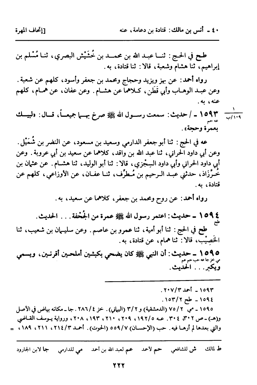 عه فِي الْحَجِّ: ثنا أَبُو جَعْفَرٍ الدَّارِمِيُّ وَسَعِيدُ بْنُ مَسْعُودٍ، عَنِ النَّضْرِ بْنِ شُمَيْلٍ، وَعَنْ أَبِي دَاوُدَ الْحَرَّانِيِّ، ثنا عَبْدُ اللَّهِ بْنُ وَاقِدٍ، كِلاهُمَا عَنْ سَعِيدِ بْنِ أَبِي عَرُوبَةَ. وَعَنْ أَبِي دَاوُدَ الْحَرَّانِيِّ وَأَبِي دَاوُدَ السِّجْزِيِّ، قَالا: ثنا أَبُو الْوَلِيدِ، ثنا هِشَامٌ. عَنْ عُثْمَانَ بْنِ خُرَّزَاذَ، حَدَّثَنِي عَبْدُ الرَّحِيمِ بْنُ مُطَرِّفٍ، ثنا عَفَّانُ، عَنِ الأَوْزَاعِيِّ، كُلُّهُمْ عَنْ قَتَادَةَ، بِهِ.