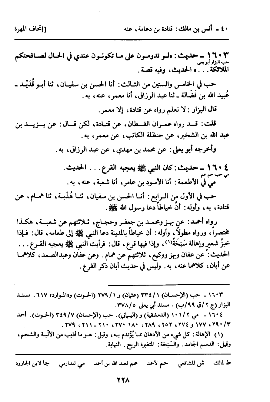 1604 - حَدِيثٌ (مي حب حم عم) : كَانَ النَّبِيُّ، صلى الله عليه وسلم، يُعْجِبُهُ الْقَرْعُ ... الْحَدِيثَ.