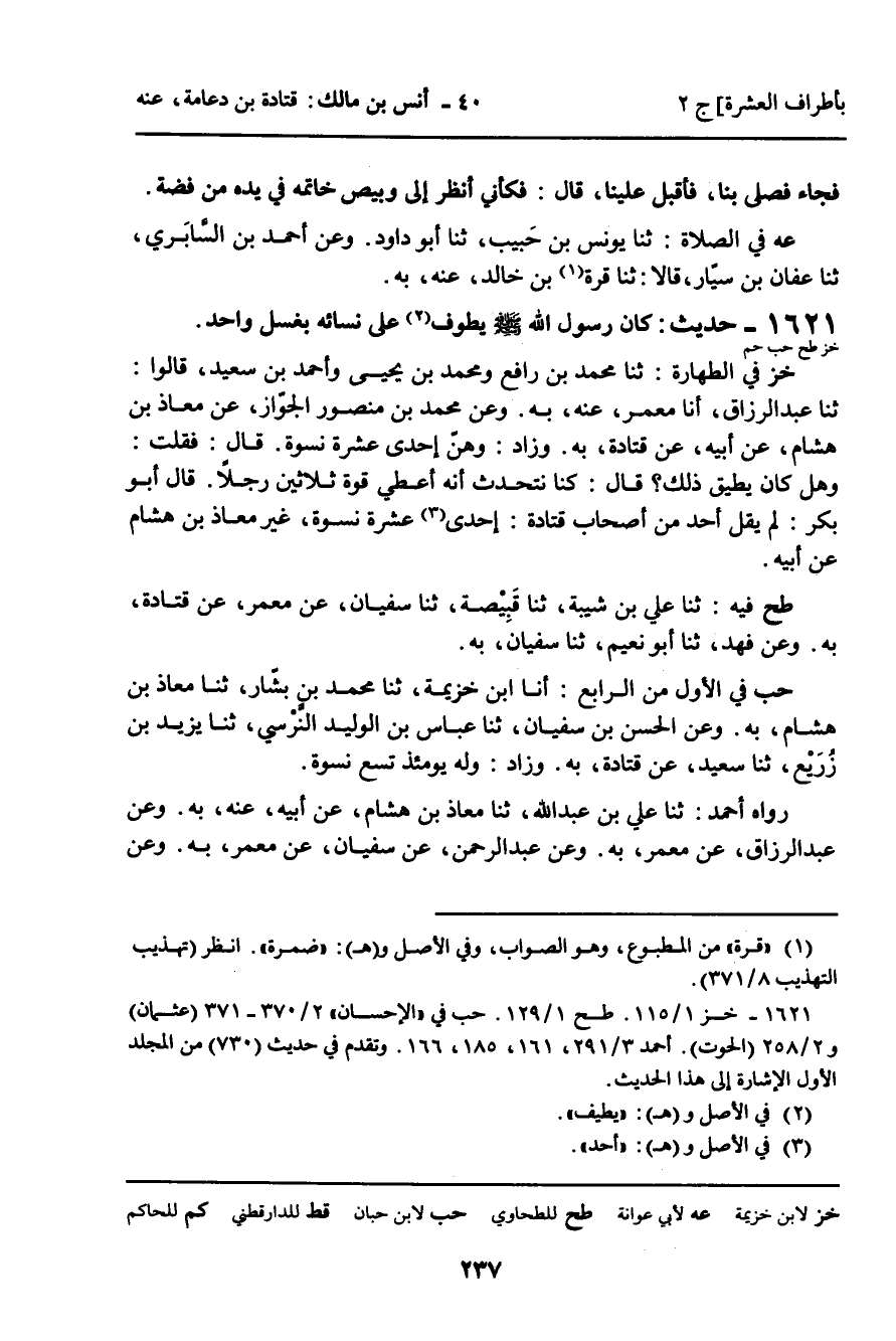 1621 - حَدِيثٌ (خز طح حب حم) : كَانَ رَسُولُ اللَّهِ، صلى الله عليه وسلم، يَطُوفُ عَلَى نِسَائِهِ بِغُسْلٍ وَاحِدٍ.